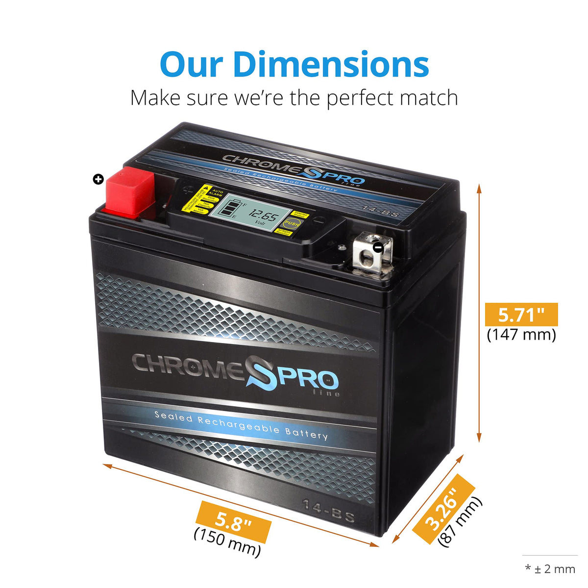 Q: What are the dimensions and weight of the Chrome Pro YTX14-BS battery?A: The Chrome Pro YTX14-BS battery has dimensions of 5.71 inches in height, 5.8 inches in length, and 3.26 inches in width. It weighs approximately 9.92 pounds.