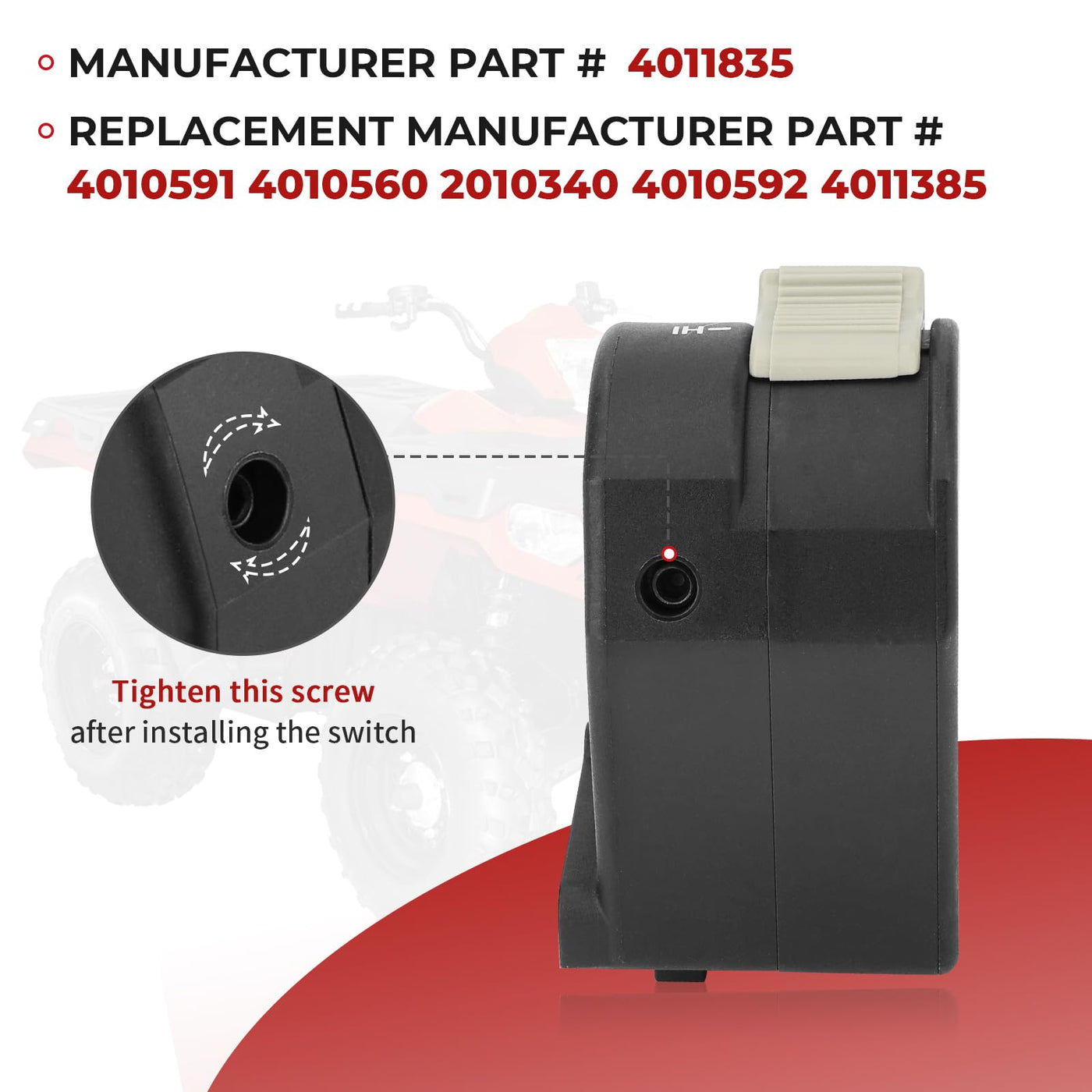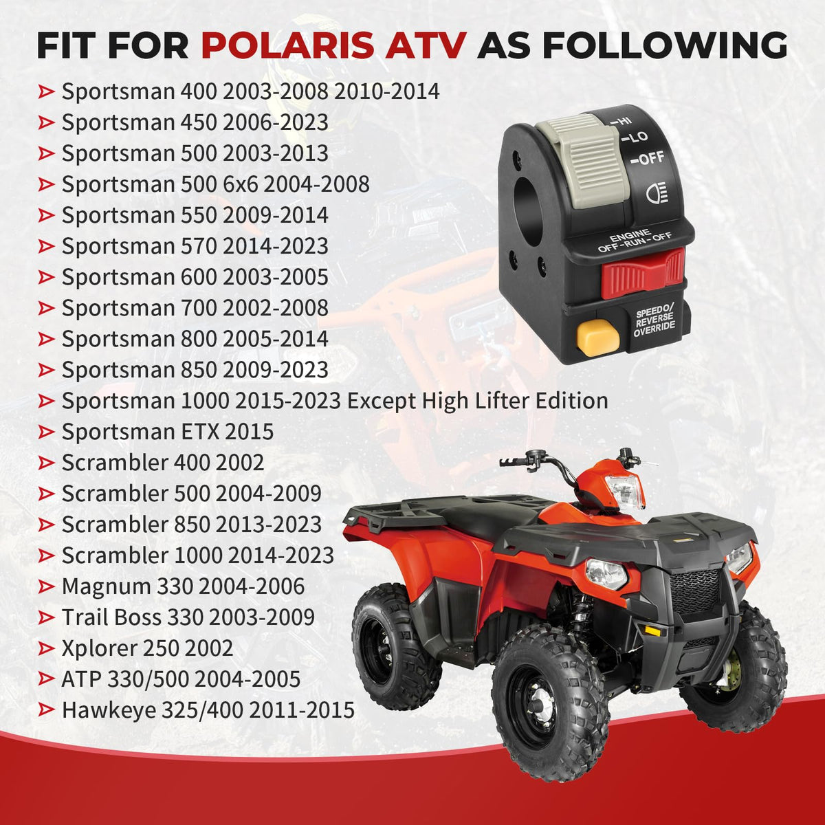 Q: What functions does this switch provide?A: This switch allows you to switch the engine off (non-start-button), control the headlight settings (HI, LO, OFF), and switch the speedometer for reverse or override functions. It enhances the overall control of your Polaris ATV.