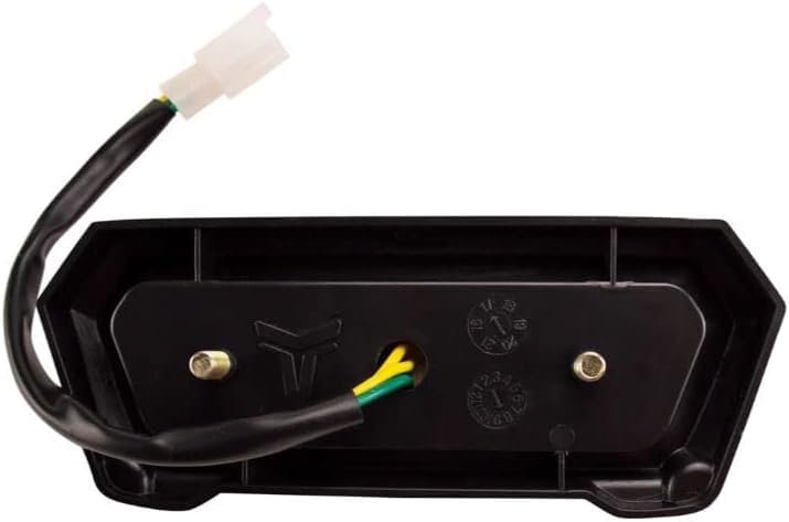 Q: What are the key features of the TAOTAO Rear Tail Brake Light?A: This brake light features a 3 wire male plug, 12 LED lights for enhanced visibility, and a durable black plastic housing with a red lens. The pigtail measures approximately 6.5 inches long, with an overall size of 156mm x 61mm (6.1" x 2.4"). It also includes two threaded studs spaced 75.5mm (3") center-to-center apart for easy installation.
