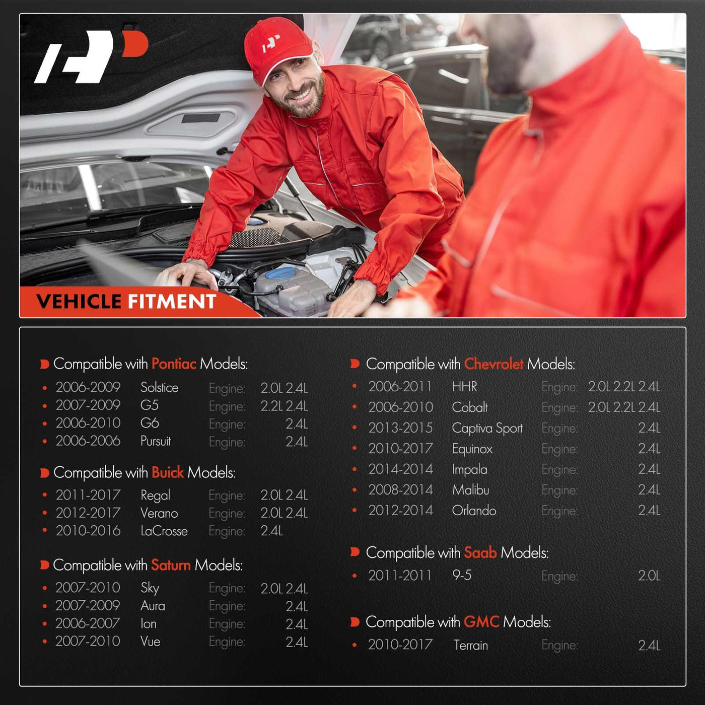 Q: What vehicles are compatible with the A-Premium VVT Intake & Exhaust Camshaft Position Actuator Solenoid Valve Kit?A: The A-Premium VVT Intake & Exhaust Camshaft Position Actuator Solenoid Valve Kit is compatible with various Chevrolet models including Equinox (2010-2017), HHR (2006-2011), Impala (2014), Malibu (2008-2014), and Cobalt (2006-2010). It also fits GMC Terrain (2010-2017), Buick LaCrosse (2010-2016), Regal (2011-2017), Verano (2012-2017), as well as Pontiac G5, G6, and Saturn vehicles with 2.0L, 2.2L, and 2.4L engines.