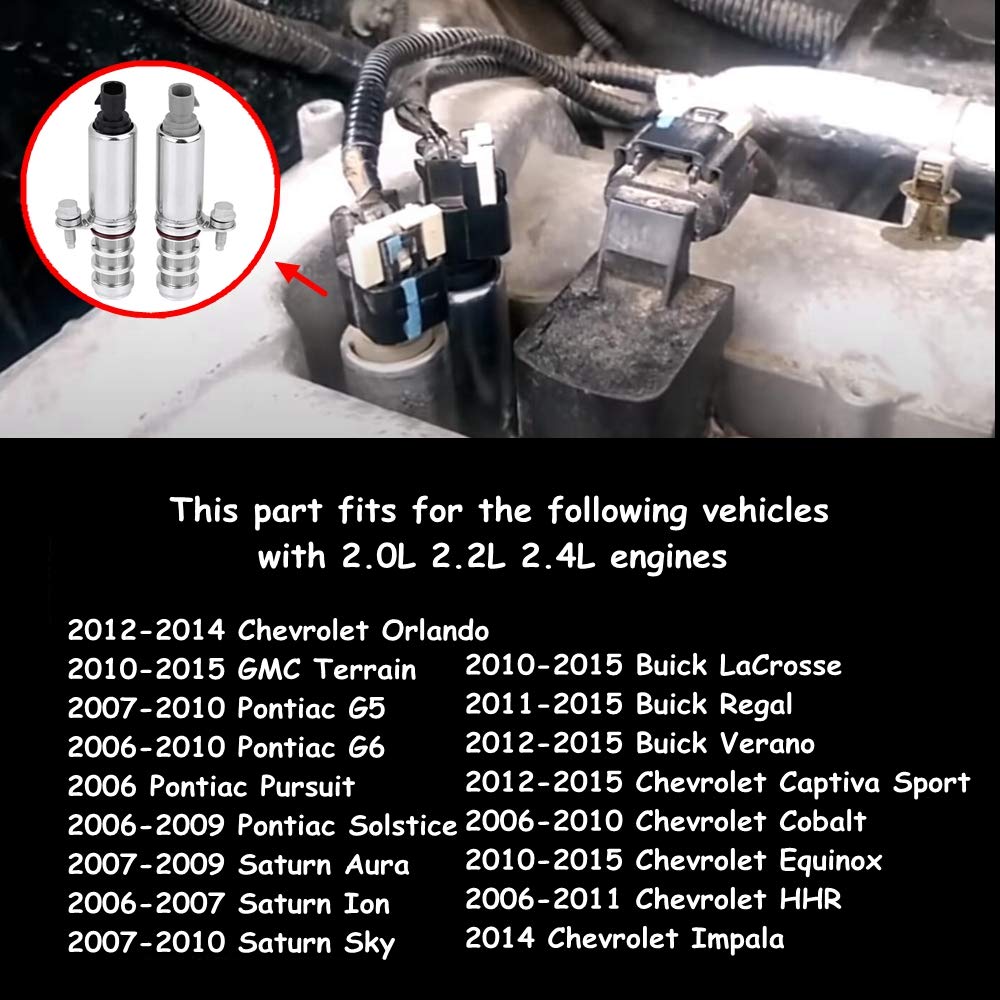 Q: What vehicles are compatible with the Intake and Exhaust Camshaft Position Actuator Solenoid Valves?A: These solenoid valves are designed to fit a wide range of vehicles from Buick, Chevy, GMC, Pontiac, and Saturn that have 2.0L, 2.2L, or 2.4L engines, including models like the Captiva, Cobalt, Equinox, HHR, Malibu, Terrain, G5, and G6.