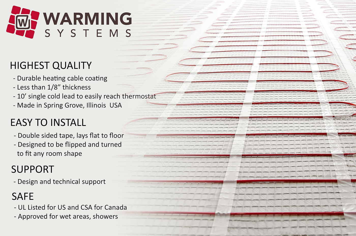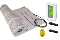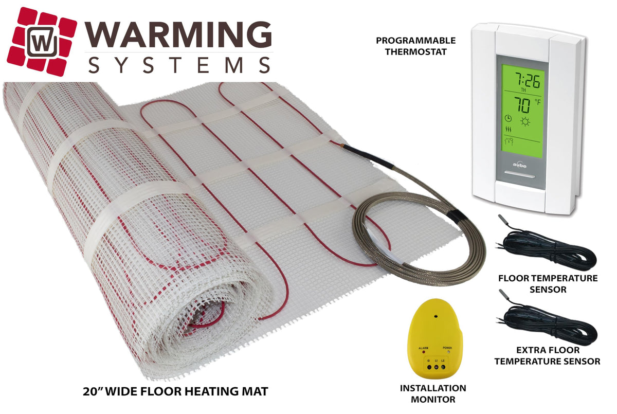 65 Square Foot Under Tile Heating Mat, Mat is 20” Wide x 39’ Long, 120 Volts | Mat has double sided tape (Adhesive Backing) to stick to floor. Lays FLAT for easy installation. | 120V, 6.5 Amp, 780W, 12 Watts/Sqft, UL Listed for USA and Canada, Cable is 1/8” thick | Digital Programmable Thermostat # TH115-AF-120, Includes floor sensor | Made in the USA using the highest quality materials, Single Cold Lead, 25 Year Warranty