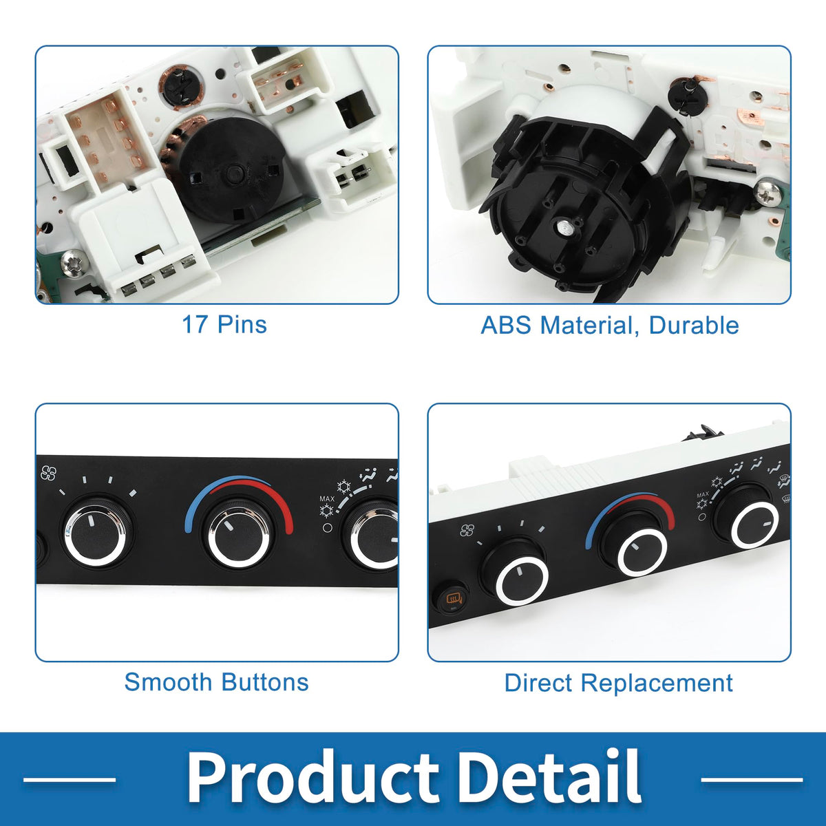 Features:Restores the function of your vehicle's heating and cooling controls, solves poor flow or no air flowing from the vents at all, and other issues.Multiple wind speed adjustment functions to meet many needsThe Module Switch is made of durable ABS plastic material lightweight, not easy to fade, and has a long service time.A good replacement for the old or broken one.Details:Color: BlackMaterial: Plastic, MetalControl Type: ManualType: HVAC Control Module Switch, Heater ControlPin Number: 17Fitment:for Chevrolet Express 1500 2008-2014for Chevrolet Express 2500 2008-2022for Chevrolet Express 3500 2008-2022for Chevrolet Express 4500 2009-2019for Chevrolet Express Cargo 2009-2023for Chevrolet Express Pasajeros 2009-2023for GMC Savana 1500 2008-2014for GMC Savana 2500 2008-2022for GMC Savana 3500 2008-2022for GMC Savana 4500 2009-2019Please Note:Please check the OE number and fitment to see if it fits your vehicle before ordering.This is non-OEM product, accessory ONLY!Package List:1 Pcs HVAC A/C Heater Climate Control Panel