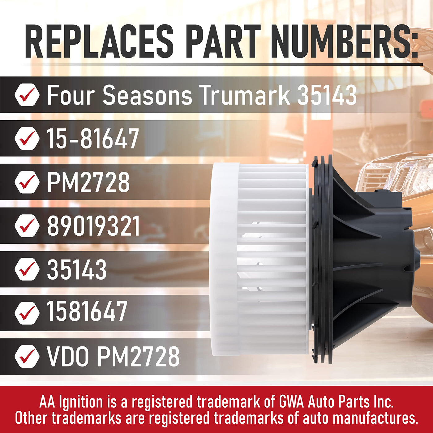 This replacement blower motor by AA Ignition comes with the fan assembly so you can get your Heater or AC System up and running again. Most commonly located under the dash on the passenger side of your vehicle. The blower motor can be installed easily with no special tools required and just by removing a few screws under the passenger side dash of your vehicle. Simply remove the old blower motor and put the new one in. It is also a advisable to replace your blower control relay/ motor resistor with a new one when you replace your blower motor. Fits the following vehicles: 2002-2006 Escalade, Escalade EXT 2003-2006 Escalade ESV 2002-2006 Avalanche 1500, 2500 1999-2006 Silverado 1500 2007 Silverado 1500 Classic, 1500 HD Classic 2001-2006 Silverado 1500 HD, 2500 HD, 3500 1999-2004 Silverado 2500 2007 Silverado 2500 HD Classic, 3500 Classic 2000-2006 Suburban 1500, 2500, Tahoe 1999-2006 Sierra 1500 2007 Sierra 1500 Classic, 1500 HD Classic 2001-2006 Sierra 1500 HD, 2500 HD, 3500 1999-2004 Sierra 2500 2007 Sierra 2500 HD Classic, 3500 Classic 2000-2006 Yukon, Yukon XL 1500, 2500 Replaces part numbers: 15-81647, PM2728, 89019321, 35143, 1581647, 35143, PM2728 This is a compatible replacement part manufactured by AA Ignition. This Blower motor is NOT a genuine OEM part. Vehicle Makes and their associated vehicle models are registered trademarks of their respective owners. These trademarks and part numbers are used in this listing only to identify the vehicles this blower motor fits. AA Ignition is a registered trade mark of GWA Auto Parts Inc.