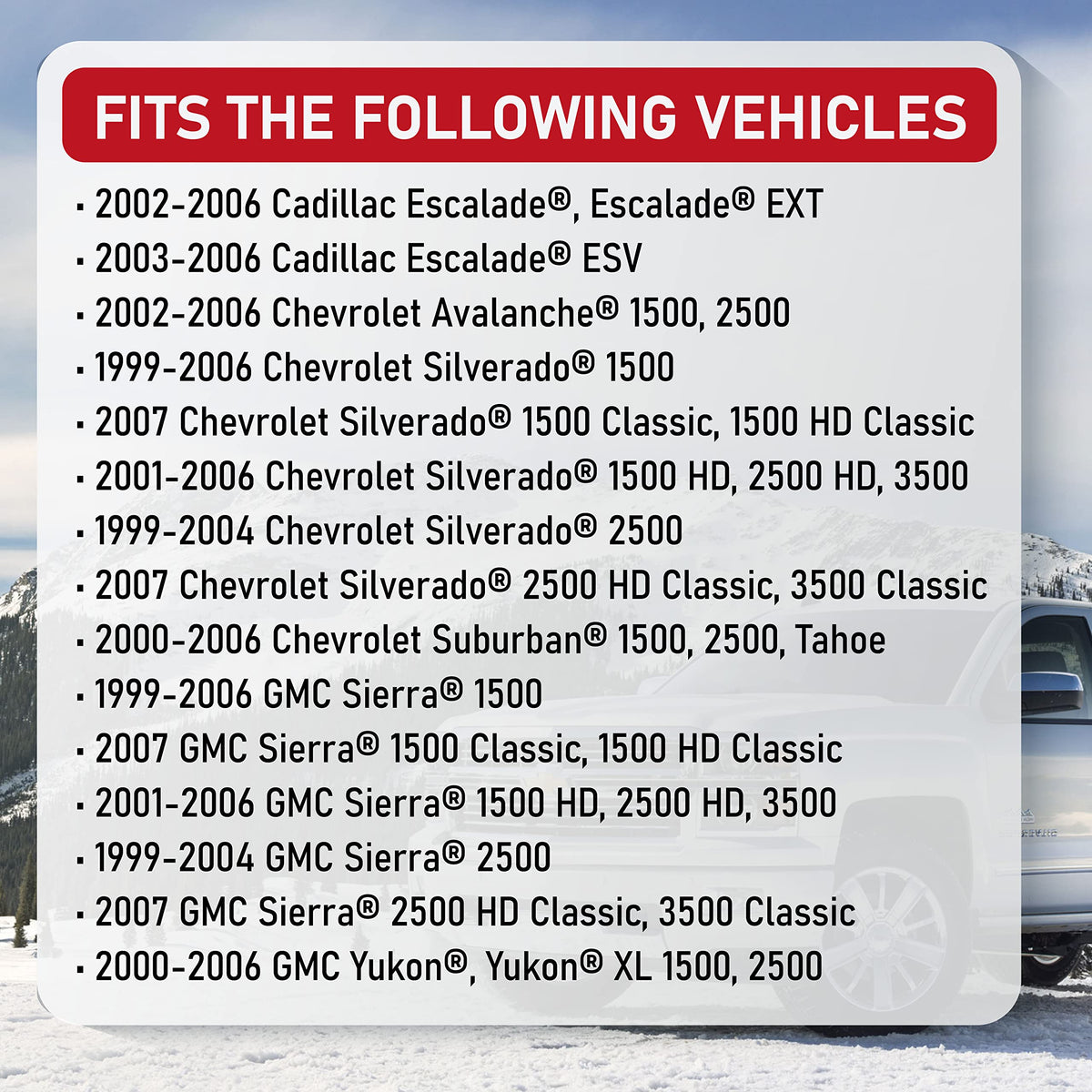 Q: What vehicles are compatible with the AC Heater Blower Motor?A: This blower motor is compatible with various Chevy, GMC, and Cadillac vehicles, including models like the 2002-2006 Escalade, 2003-2006 Escalade ESV, 2002-2006 Avalanche 1500 and 2500, 1999-2006 Silverado 1500 and 2500, 2000-2006 Suburban and Tahoe, and 1999-2006 Sierra models.