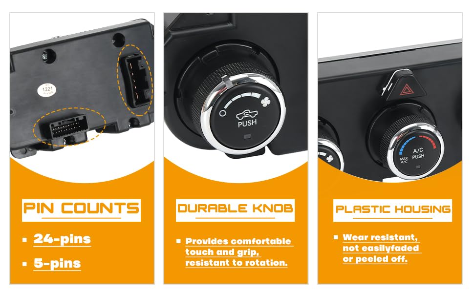 Application: For Ram 1500 Pickup 2013; For Ram 2500/3500 Pickup 2013-2018.(Part Number:68268189AA, 68105021AE, 68226600AA, 68236775AB, 68105021AF) Specification: 2 Plugs; 4 Gears.(Notice: Our AC control panel does not come with dual zone control; equipped with rear defrost function!!!) Function: It can solve poor flow or no air flowing from the vents issues, allowing you to adjust the temperature and wind speed according to your own needs and enjoy comfortable air temperature inside the car. Housing Material: The switch housing is made of plastic, the knob is not easy to break, rotates flexibly, is not easy to fade or fall off, and is wear-resistant and durable. Internal Material: The plug part of this product is made of copper, with good conductivity, fast transmission speed, and corrosion resistance.