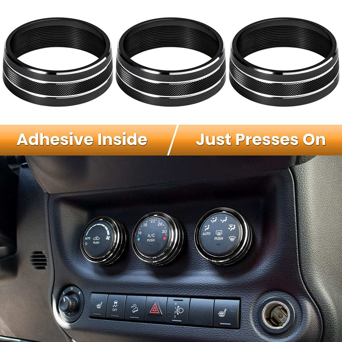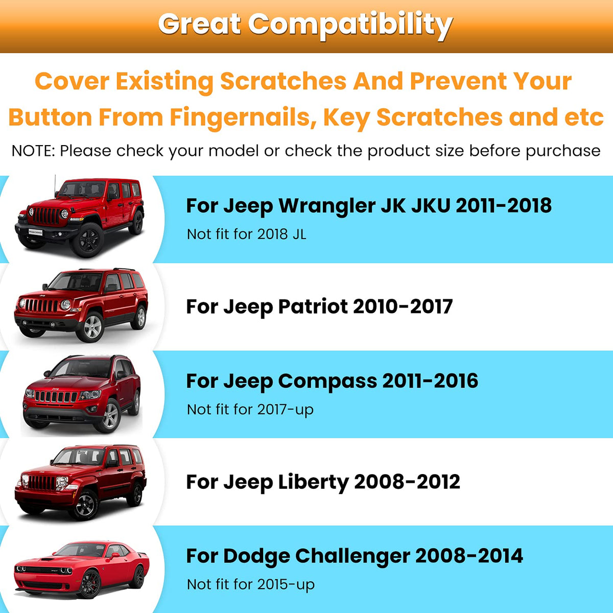Q: Is this button cover compatible with my Jeep model?A: Yes, this Audio Air Conditioning Button Cover is compatible with Jeep Wrangler JK JKU models from 2011 to 2018, Jeep Liberty from 2008 to 2012, Jeep Patriot from 2010 to 2017, Jeep Compass from 2011 to 2016 (not compatible with 2017-current), and Dodge Challenger from 2008 to 2014 (not compatible with 2015-current).