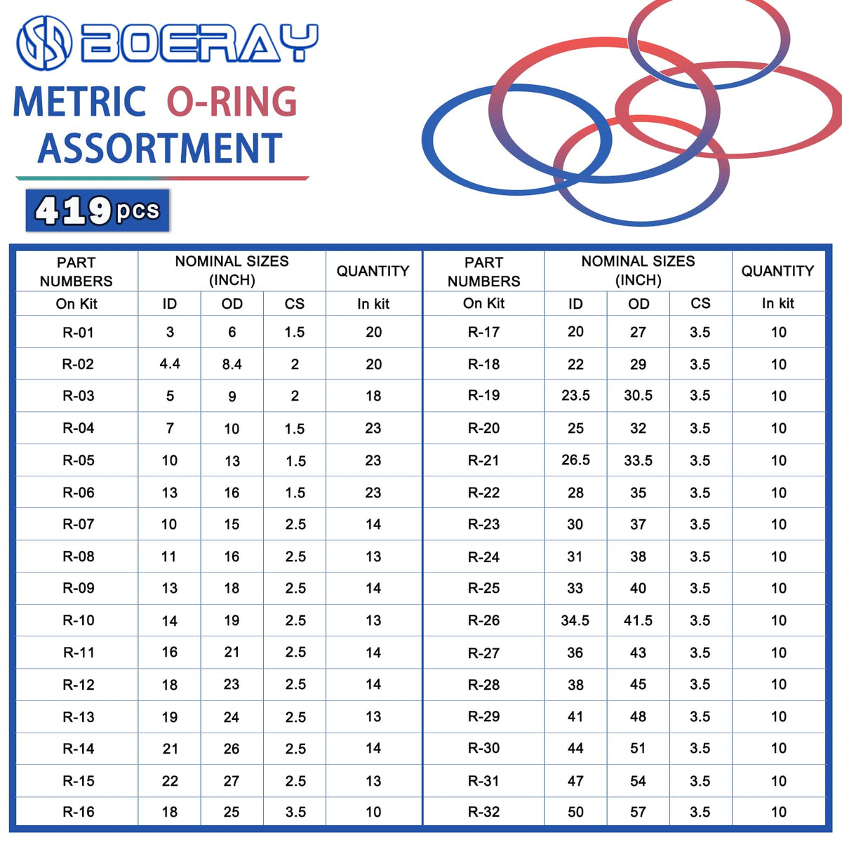 The O-Ring Set Includes 407 Sae O-Rings And 419 Metric O-Rings In The 32 Most Needed Sizes; Sae O-Rings Range From -006 To -226 And Metric O-Rings Cover Inner Diameters From 3 To 50Mm And Outer Diameters From 6 To 57Mm