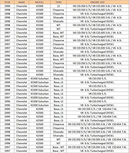 Q: What vehicles are compatible with the Comfort Auto A/C compressor?A: The Comfort Auto A/C compressor is compatible with 1996-1999 Chevrolet K1500, K2500, K3500, and models like Silverado, Suburban, and Cheyenne, featuring V8 CID: 350 5.7L, V8 CID: 305 5.0L, V6 4.3L, and V8 6.5L Turbocharged Diesel engines.