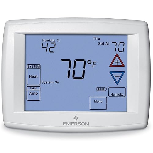 Q: What are the key features of the Emerson 1F95-1291 thermostat?A: The Emerson 1F95-1291 thermostat features a large 12 in. touchscreen display, humidity control for humidifiers and dehumidifiers, a 7-day programmable schedule allowing different settings for each day of the week, and extensive compatibility with most heating and cooling systems, including heat pumps.