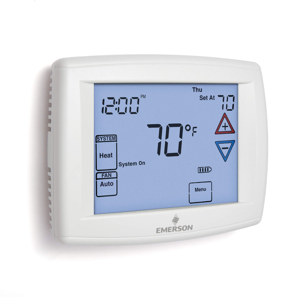 The Emerson Blue 1F95-1291 thermostat is a programmable touchscreen thermostat that allows you set a different schedule for each day of the week. The large 12 in. display guides you through set-up, programming and operation with only the touch keys you need to see. With its extensive* compatibility, this thermostat works with most furnaces, air conditioners, and heat pump systems, including dual fuel systems. *Not compatible with electric baseboard heat and some other systems.