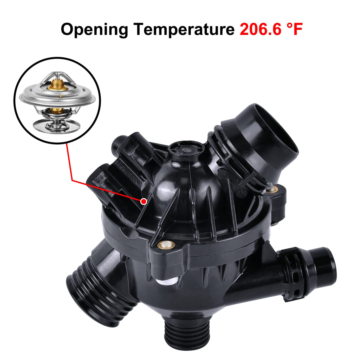 Q: What are the key features of the EVIL ENERGY Thermostat Housing Assembly?A: Key features include compatibility with multiple BMW models, an opening temperature of 206.6°F/97℃, and a package that contains one thermostat, a rubber gasket, and a plastic housing. This assembly is designed to enhance engine performance and longevity.