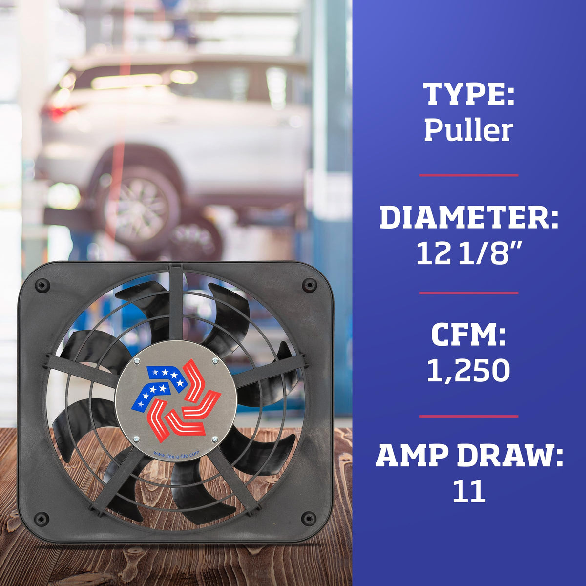 The 12-1/8 Inch Flex-A-Lite Lo-Profile S-Blade Electric Fan is one of the lowest-profile automotive fans on the market, making it a great option for cooling where clearance is an issue. This cooling fan moves 1250 cfm (cubic feet per minute) of airflow, with eight S-blades that produce less noise than other cooling car accessories. With overall dimensions of 13-1/2 x 15 x 2-5/8 inches, this car fan draws 11 amps from a 12-volt power supply and is built in the USA with globally sourced materials. This puller radiator fan is designed to fit in tight engine compartments and increases engine power when used as a stock belt-driven fan replacement. Mount this Flex-A-Lite Puller Lo-Profile S-Blade Electric Fan with the included universal mounting brackets.