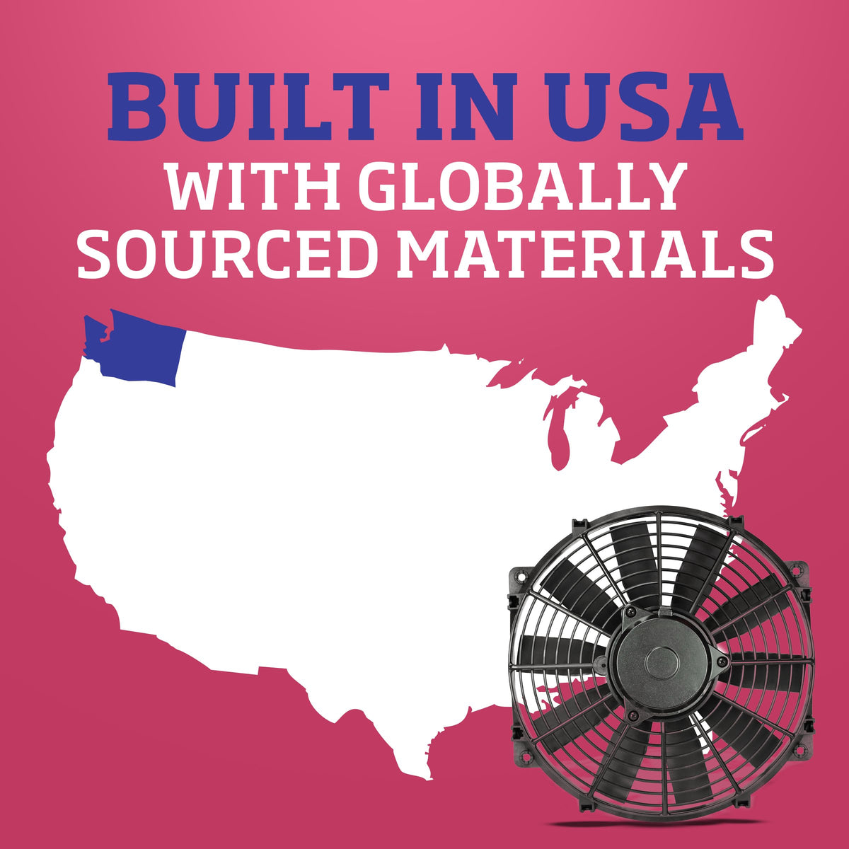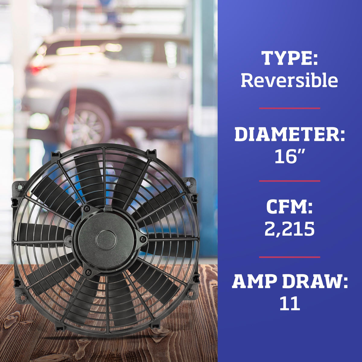 The 16 Inch Flex-A-Lite Trimline Reversible Electric Fan is an economical cooling fan you can use as a primary or auxiliary fan. This cooling fan moves 2215 cfm (cubic feet per minute) of airflow and can be easily reversed by turning the blade over, securing it with the E-clip, and connecting the fan wires in the opposite direction. With overall dimensions of 16 x 16-1/2 x 3-3/4 inches, this car fan draws 11 amps from a 12-volt power supply and is built in the USA with globally sourced materials. Replace your primary stock belt fan with this reversible electric fan to help free up wasted horsepower and increase gas mileage. You can also use it as a pusher or auxiliary radiator fan to provide additional cooling in an engine prone to overheating. This automotive fan features ten straight blades capable of pushing or pulling more cool air through the radiator than S-blade fan car accessories to help improve engine efficiency. Whether used as a pusher or a puller fan, the Flex-A-Lite Trimline Reversible Electric Fan is designed to increase the cooling performance of engines.