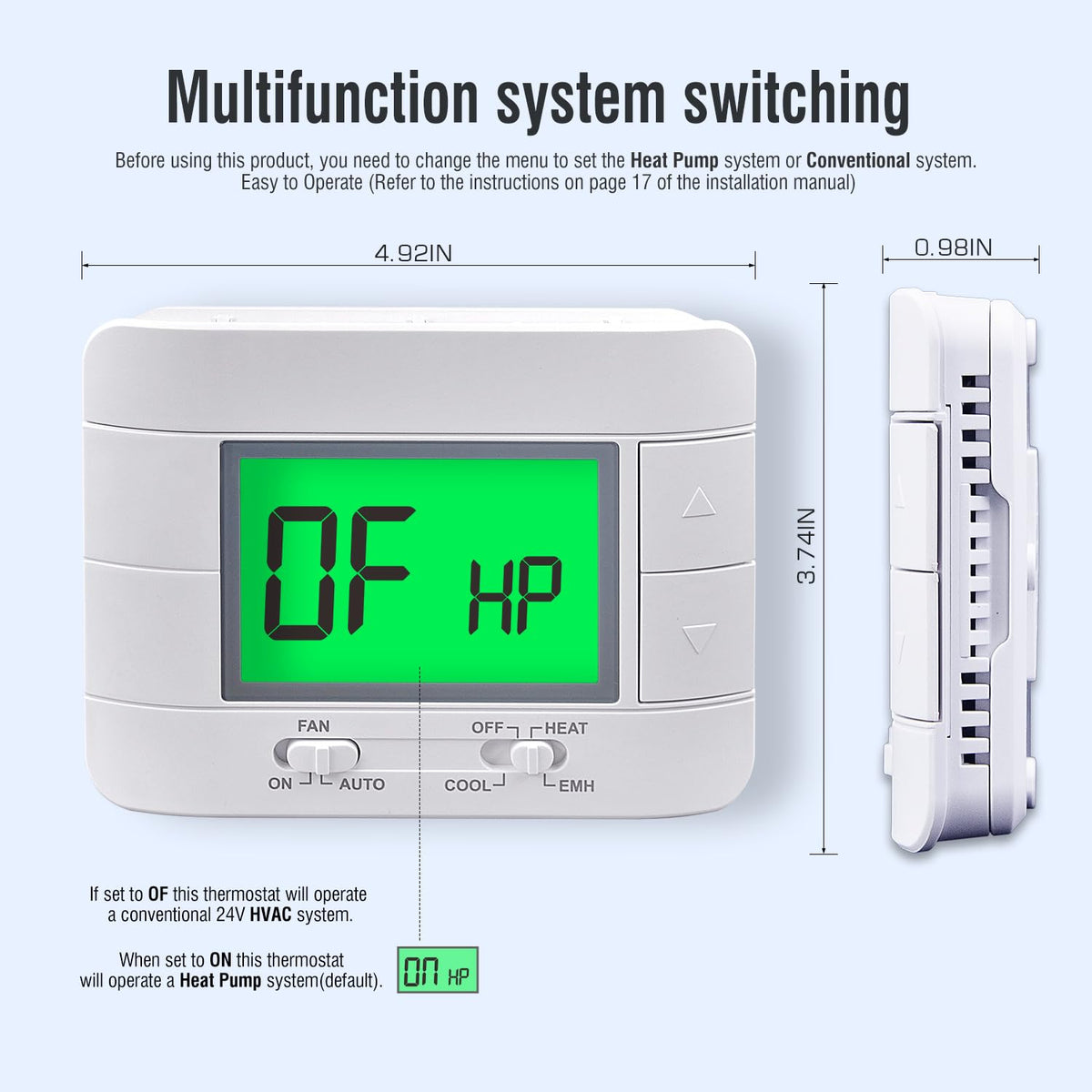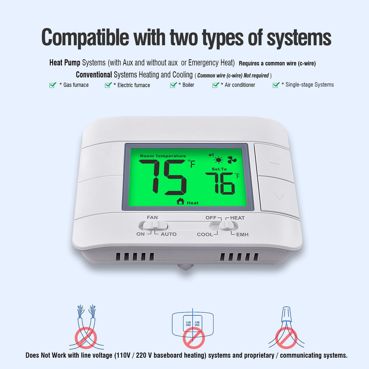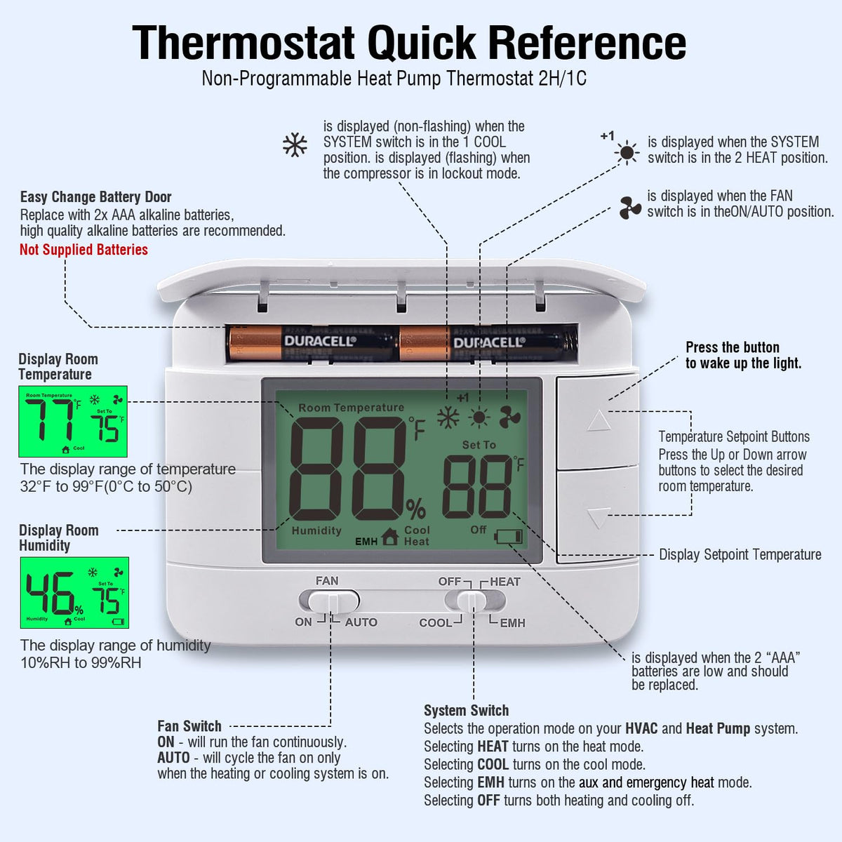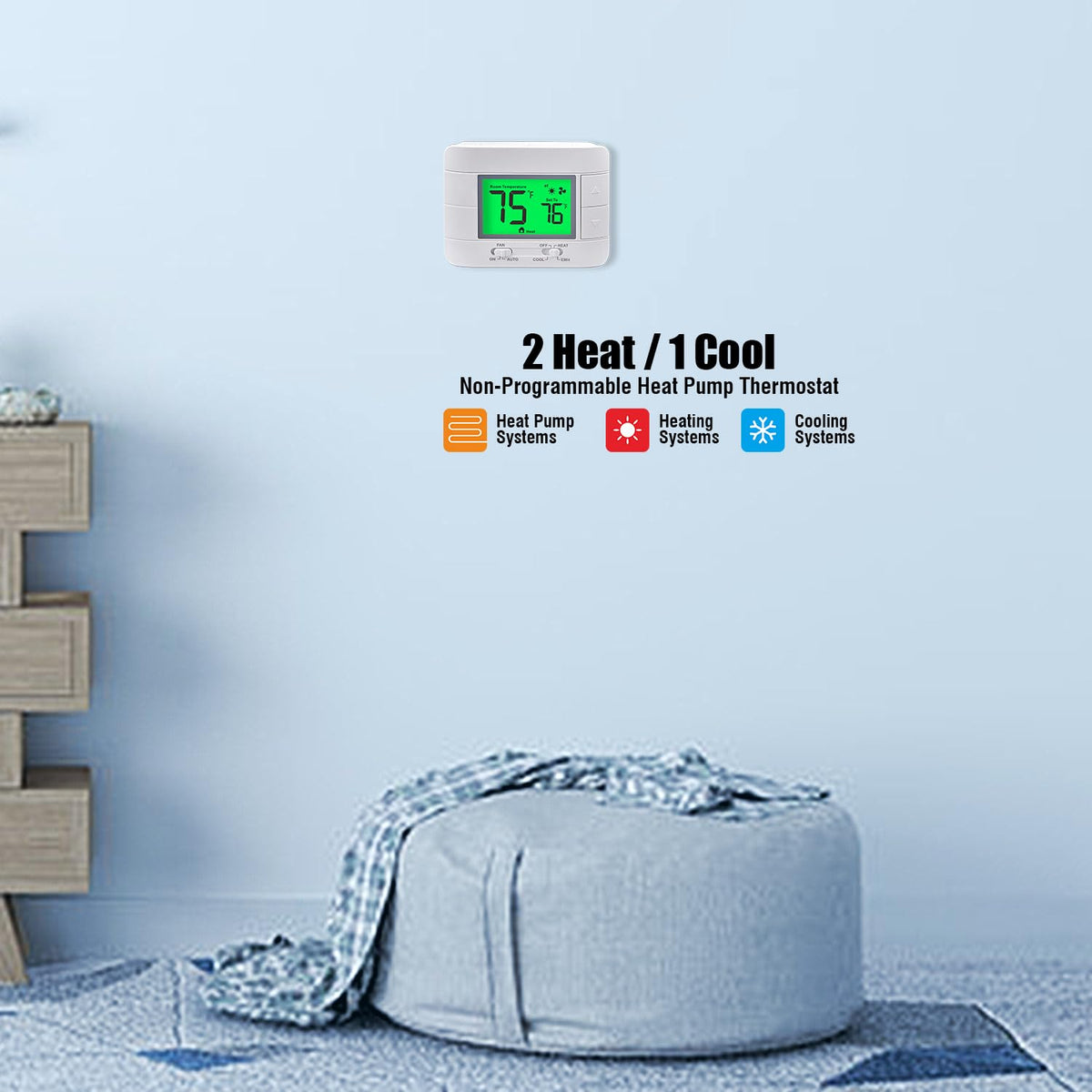 Garystat Non-Programmable Heat Pump Thermostat For House 2 Heat/1 Cool, With Temperature & Humidity Monitor And Large Green Lcd