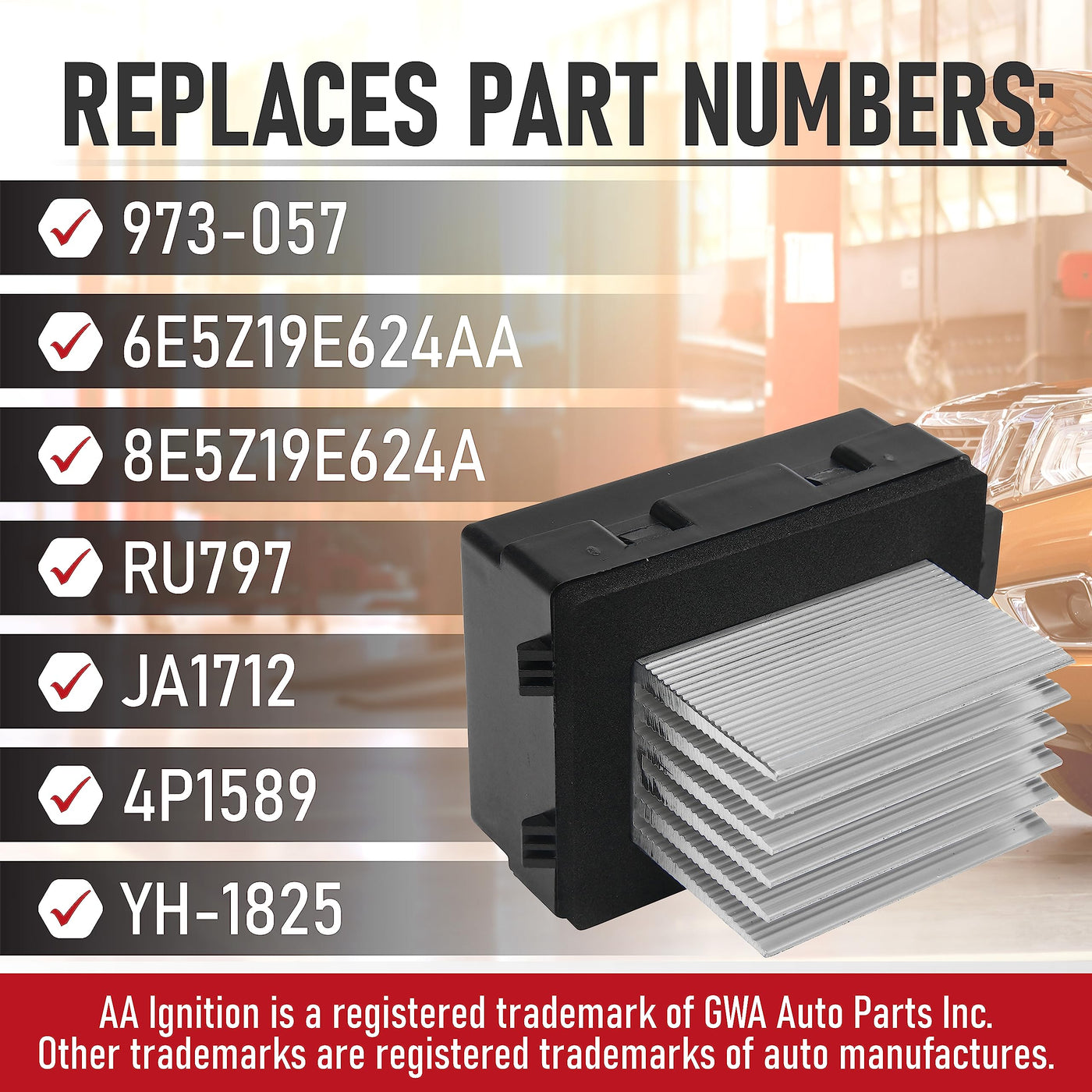 The blower motor resistor controls the fan speed in your AC and heating system. If you can no longer adjust the air speed with your AC controls or your air conditioner system no longer blows chances are you need a new Blower Motor Resistor. Compatible with the following vehicles 2010-2012 Fusion 2010-2012 MKZ 2010-2011 Milan Replaces part numbers: 973-057, 6E5Z19E624AA, 8E5Z19E624A, RU797, JA1712, 4P1589, YH-1825 This is a compatible replacement part manufactured by AA Ignition. This blower motor control module is NOT a genuine OEM part. Vehicle makes and their associated vehicle models and part numbers are used in this listing only to identify the vehicles this blower motor resistor fits.