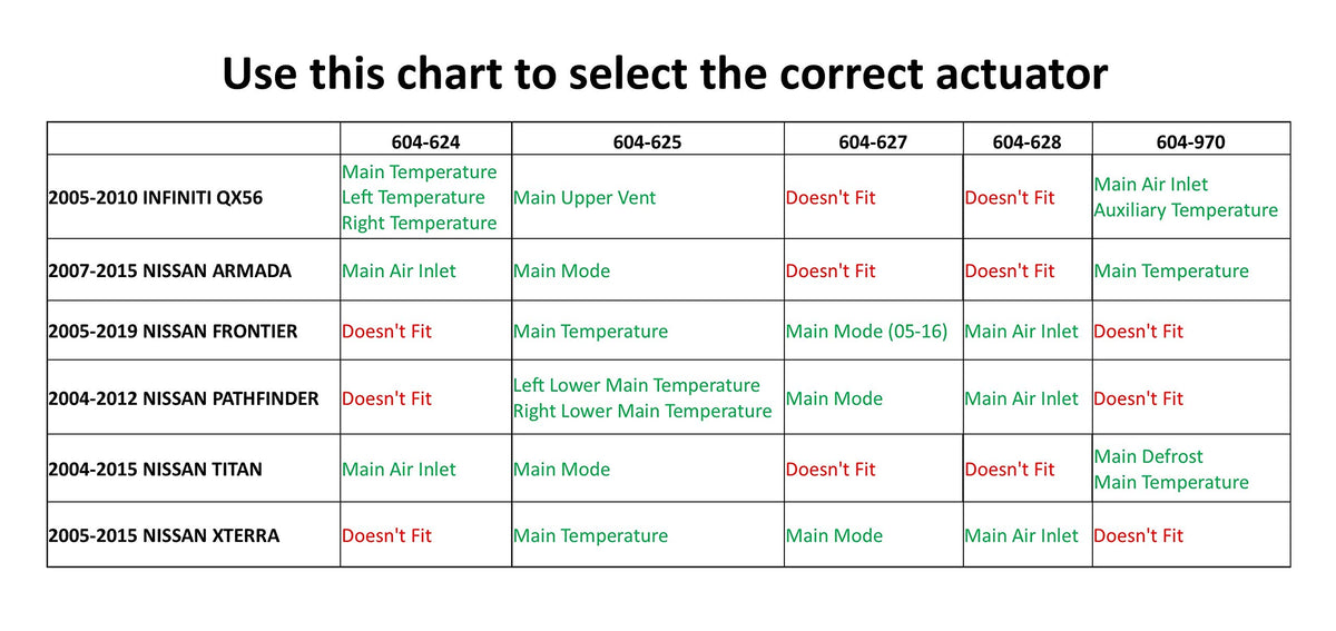 Q: What vehicles are compatible with the HVAC Heater Blend Door Actuator?A: The HVAC Heater Blend Door Actuator is compatible with various INFINITI and NISSAN models that utilize OEM part numbers 27743-5Z010, 27743-ZH10A, as well as other part numbers like 604-625. To ensure compatibility, please refer to the function chart provided in the product images.