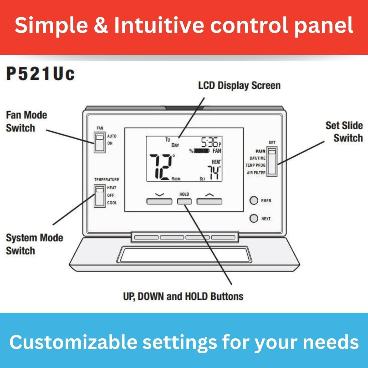 Q: How does the programmable function work on the Lux Pro P521U?A: The programmable function allows you to customize temperature settings based on your weekly schedule. You can program different temperatures for weekdays and weekends, helping you save energy and maintain comfort when you're home or away.