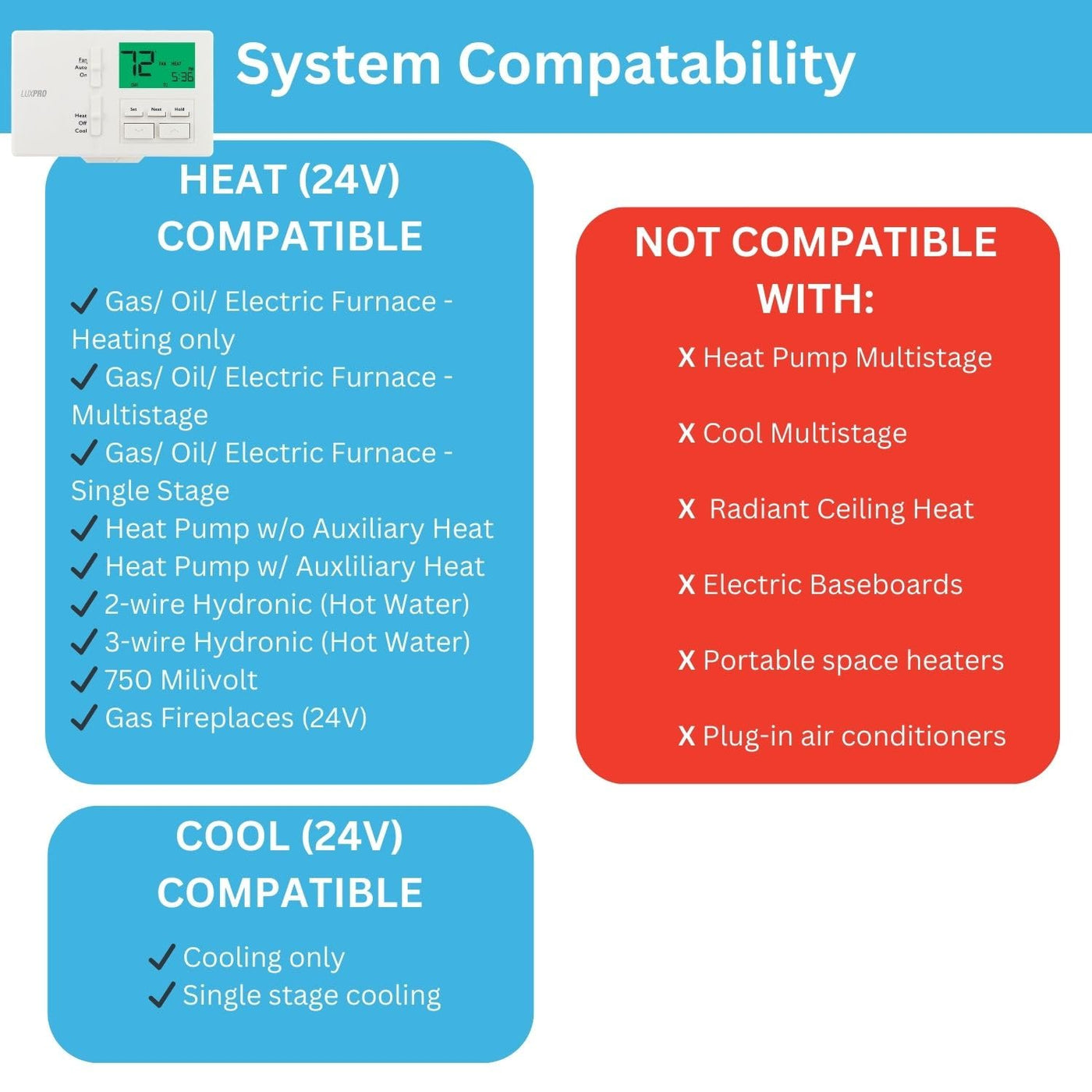 Q: Is the Lux Pro P521U compatible with my heating and cooling system?A: Yes, the Lux Pro P521U is compatible with 2 heat and 1 cool systems, making it suitable for a variety of home heating and cooling configurations.