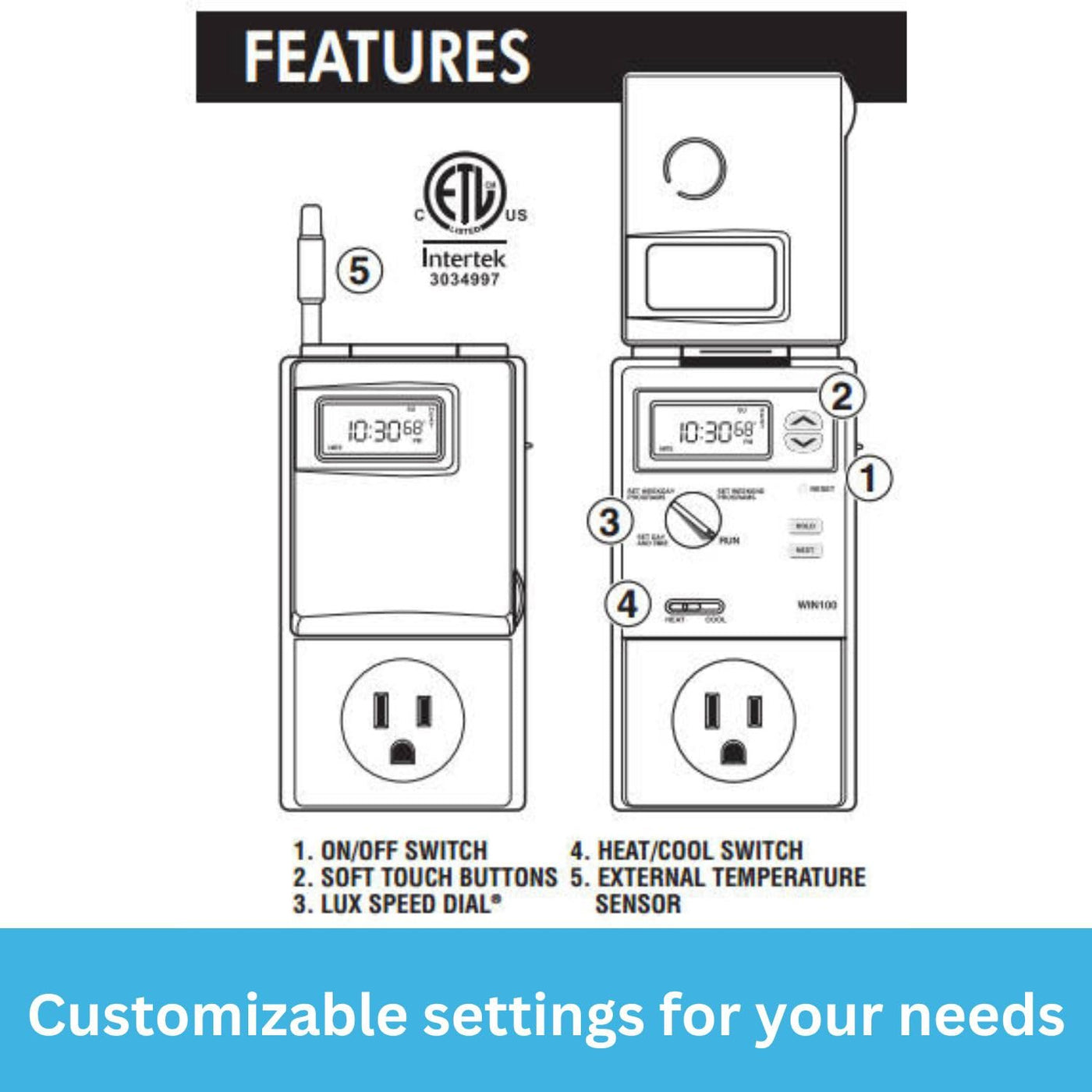 Amazon.comDesigned for use with space heaters and air conditioners that automatically restart after power reconnection, the Lux WIN100 5-2 Day Heating and Cooling Programmable Outlet Thermostat offers the comfort, convenience, and energy saving benefits of full programmability. To use, just plug the WIN100 into an outlet, plug your portable heating or cooling unit into the thermostat, and you're ready to go.WIN100 5-2 DayHeating and CoolingProgrammable Outlet ThermostatAt a Glance: Programmable thermostat for portable air conditioning and heating unitsSet separate weekend/weekday programsPlugs into a standard 120-volt household outlet (with ground)Easy operation-- patented Lux Speed Dial, on/off switch, and memory storageSaves money and energy without sacrificing comfortElectronic accuracy; 100% mercury freeThe WIN100 can be programmed before it's plugged into the wall.The patented Lux Speed Dial allows for easy programming.Create Different Programs for Weekdays and WeekendsThe WIN100 allows you to enjoy the benefits of a programmable thermostat for your heating or cooling unit. This model offers the convenience of 5-2 day programming so you can create different programs for weekdays and weekends.The WIN100 also boasts a positive on/off switch, and a heat/cool switch that allows the use of this product for two seasons: summer and winter.User-Friendly OperationOffering straight-forward operation, the WIN100 has a patented Lux Speed Dial for easy programming, a positive on/off switch for streamlined operation, and battery-free memory storage.For added convenience, this ETL-approved thermostat can be programmed before it's plugged into the wall. Once programmed, it operates off of a standard 120-volt wall outlet (with ground), and it comes with two 1.5-volt G13 alkaline button cell batteries for the clock.Save Money and the EnvironmentLike all programmable thermostats, the WIN100 helps reduce energy consumption, but this efficient device takes savings a step further. To maximize your home's energy efficiency, the WIN100 comes preprogrammed with default heating and cooling schedules that are designed to save up to 33% on energy costs over a year and also help cut down on your carbon footprint. Because the WIN100 is 100% mercury free, you can be sure it's a safe and environmentally conscious choice for your home.About Lux: Innovation, Quality, and ValueSince 1914, Lux Products Corporation has manufactured quality products for the home. It all began with turn-of-the-century timing devices, the forerunners of the now world-famous Lux 60-Minute Timers. Building on the success of these simple and utilitarian items, Lux grew into the multifaceted manufacturer and merchandiser it is today. The Lux name has always stood for innovation, quality, and value. The company's full line of electronic and mechanical thermostats offers models for nearly every heating and cooling application. See how you can save money and conserve energy with Lux.What's in the BoxLux WIN100 5-2 Day Heating and Cooling Programmable Outlet Thermostat, installation guide, instruction manual, and two 1.5 volt G13 alkaline button cell batteries.Not sure which model is right for you?Click here for a complete comparison LUX programmable thermostats.Product DescriptionGet precise temperature control with the Lux Pro digital thermostat. Its large, easy-to-read display with backlight ensures clear visibility. The factory-set temperature control is fixed at +/- 0.5ºF/C. Note that this model is battery-powered only.