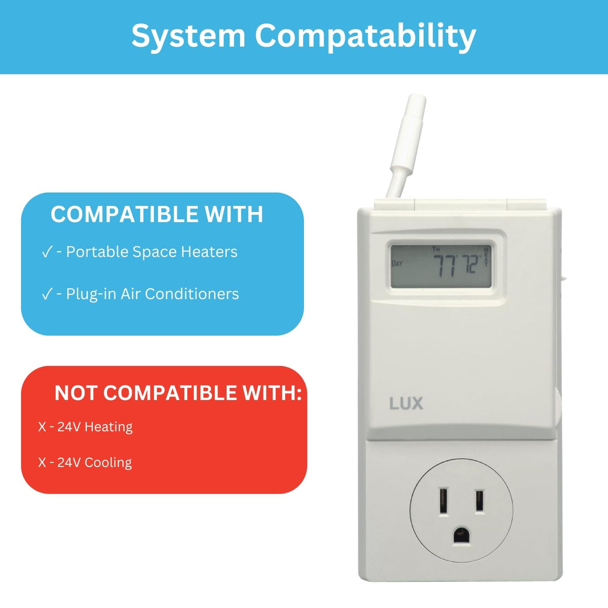 Q: Is the Lux WIN100 compatible with my air conditioner or heater?A: Yes, the Lux WIN100 is compatible with most portable space heaters, window air conditioners, and circulating fans. It works effectively with devices that automatically restart after a power interruption, making it a versatile choice for controlling your indoor climate.