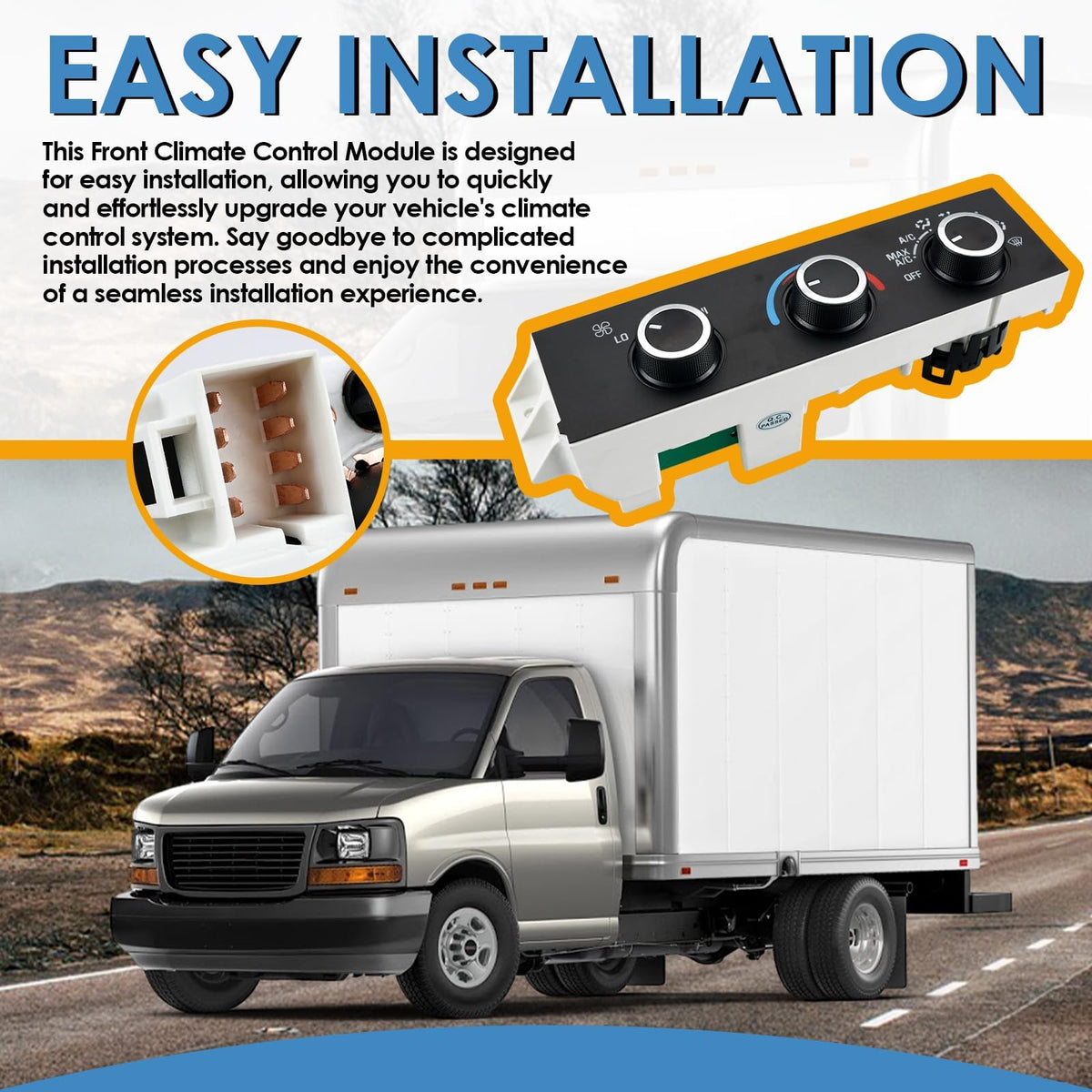 ?VEHICLE MODEL FIT?Compatible with 1996-2014 Chevrolet Express 1500, compatible with 1996-2020 Chevrolet Express 2500, compatible with 1996-2020 Chevrolet Express 3500, compatible with 2009-2020 Chevrolet Express 4500, compatible with 1996-2020 GMC Savana 2500, compatible with 1996-2020 GMC Savana 3500, compatible with 2009-2019 GMC Savana 4500. For more applicable models, please refer to the list of models in the description. | ?REPLACE PART NUMBER?599-217, 15073274, 15130959, 15191308, 15773678, 15858578, 16238445, 19370220, 23283455, 25753629, 84106610, 84288985, 84555663, 84793087, 9375795, 93804402, 94666468. | ?Seamless Integration with Factory Look and Feel?Our unit is identical in appearance to the factory module, preserving the original look and feel of your vehicle's interior. It seamlessly integrates into your vehicle's dashboard, giving a professional and polished finish. | ?Easy Plug-and-Play Installation?Our climate control module is designed to be easily installed in your vehicle. Simply plug it in and it will automatically configure itself to your vehicle, eliminating the need for any manual setup. | ?QUALITY SERVICE?If you encounter any issues with the product, please feel free to contact our customer service. Our dedicated team is available 24 hours a day to assist you and resolve any problems you may have within 24 hours.
