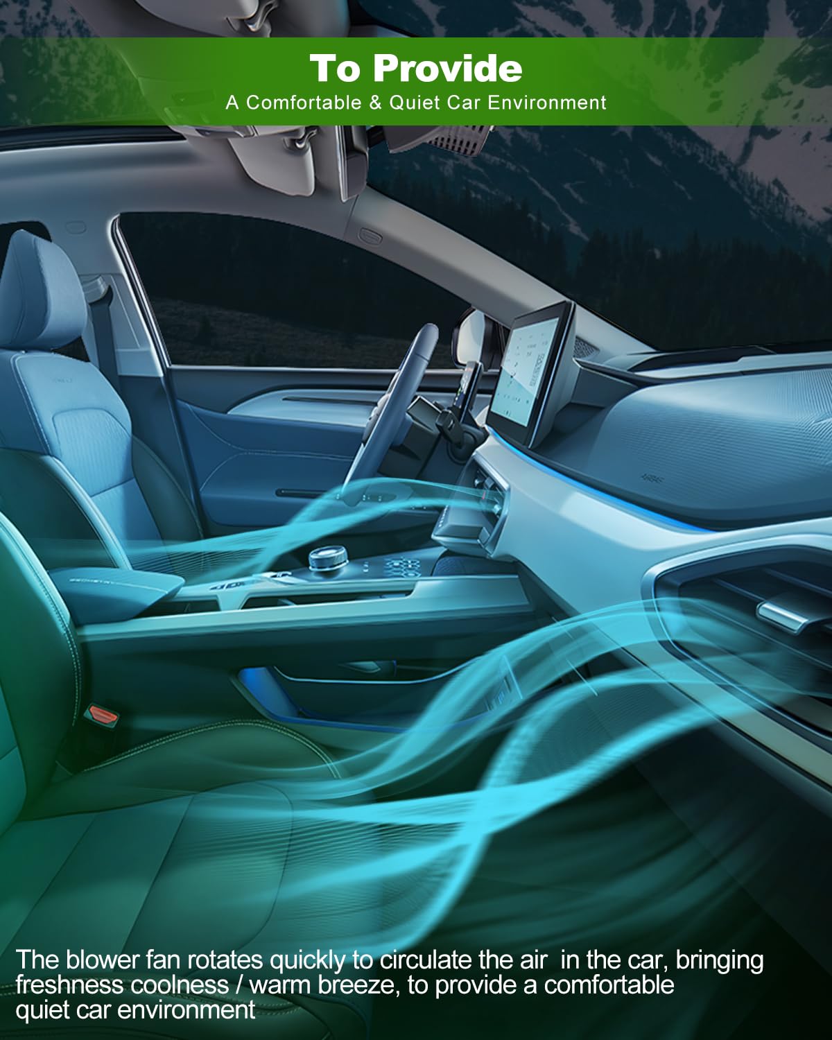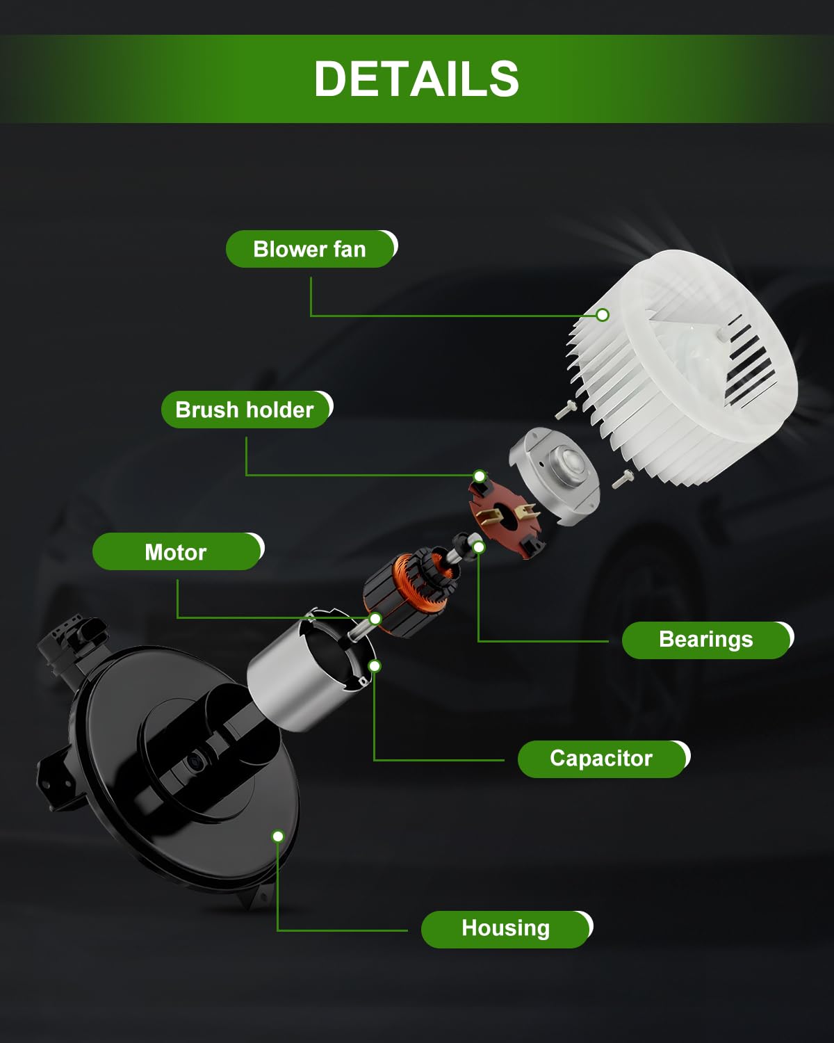 Q: How does the blower motor improve vehicle heating and cooling performance?A: This blower motor features strong wind power and operates quietly, enhancing the efficiency of your vehicle's heating and cooling system. Its design includes permanently lubricated self-aligning bearings that ensure reliable performance and a longer lifespan.