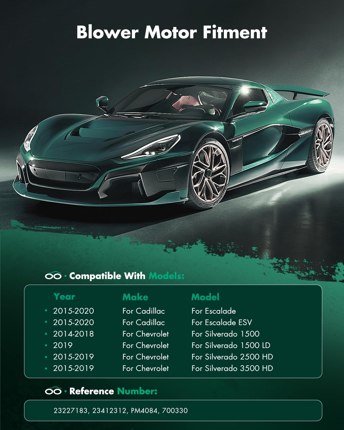 About Front HVAC Fan Blower Replacement MotorAC Fan Blower Motor compatibles with - 2015-2020 for Cadillac Escalade/2015-2020 for Cadillac Escalade ESV/2014-2018 for Chevrolet Silverado 1500/2019 for Chevrolet Silverado 1500 LD/2015-2019 for Chevrolet Silverado 2500 HD/2015-2019 for Chevrolet Silverado 3500 HD/2015-2020 for Chevrolet Suburban/2016-2019 for Chevrolet Suburban 3500 HD/2015-2020 for Chevrolet Tahoe/2014-2018 for GMC Sierra 1500/2019 for GMC Sierra 1500 Limited/2015-2019 for GMC Sierra 2500 HD/2015-2019 for GMC Sierra 3500 HD/2015-2020 for GMC Yukon/2015-2020 for GMC Yukon XLPackage Includes 1 Fan Blower Motor Coutions.Please check above compatibility list to make sure it fits your vehicle and contact us - SCITOO if you have a trouble.Note: Please properly verify the Year/Make/Model before purchasing this product, in avoid of unnecessary charges.