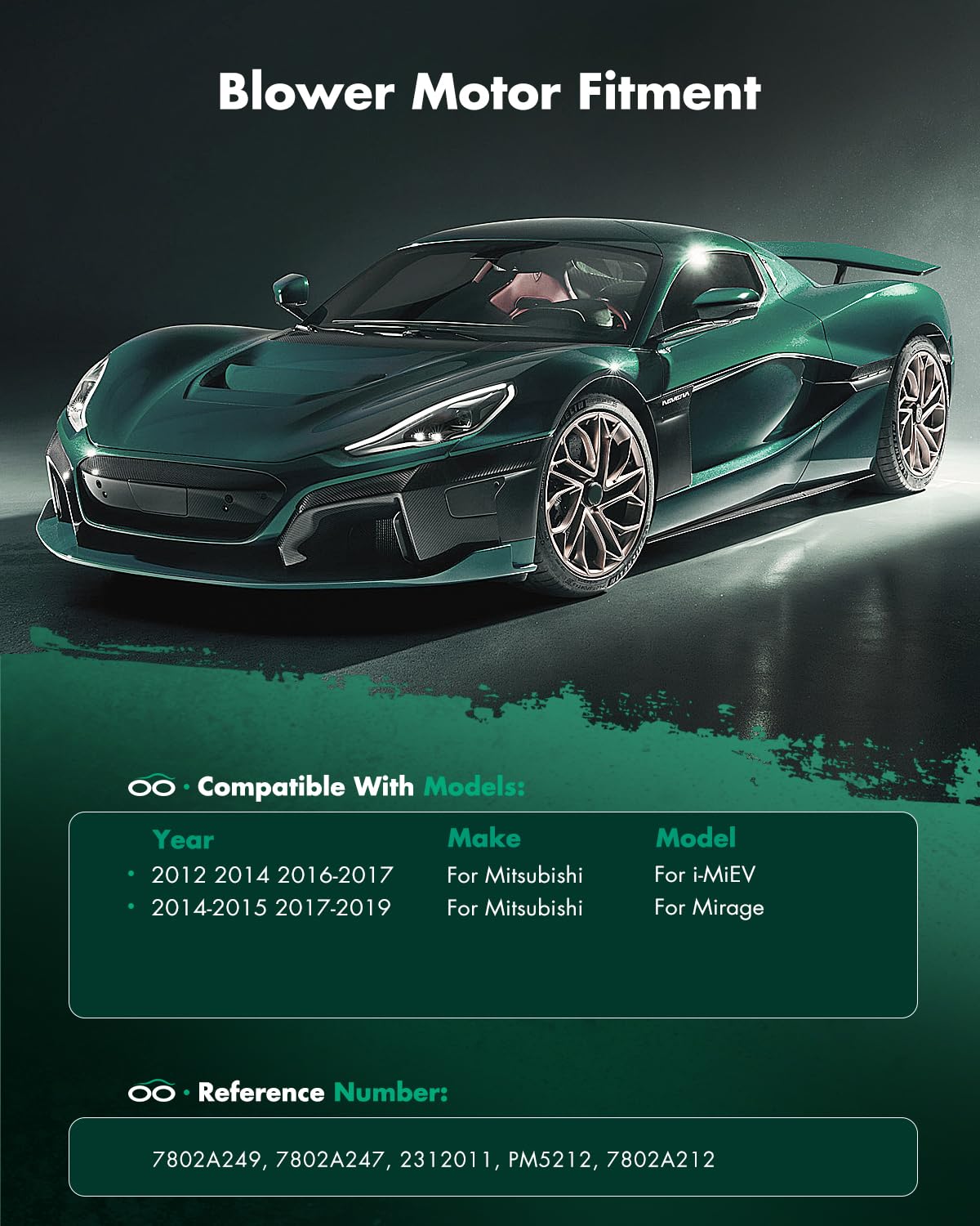 About Front HVAC Fan Blower Resistor Replacement MotorAC Fan Blower Motor compatibles with - 2014-2015 Mitsubishi Mirage DE Hatchback2014,2015,2017,2018 Mitsubishi Mirage ES Hatchback2017-2018 Mitsubishi Mirage ES Plus Hatchback2017-2018 Mitsubishi Mirage G4 ES Sedan2018 Mitsubishi Mirage G4 GT Sedan2017-2018 Mitsubishi Mirage G4 SE Sedan2017-2018 Mitsubishi Mirage G4 SEL Sedan2015-2018 Mitsubishi Mirage GLS Hatchback2015-2018 Mitsubishi Mirage GLX Hatchback2017-2018 Mitsubishi Mirage GT Hatchback2015 Mitsubishi Mirage RF Hatchback2014,2015,2017,2018 Mitsubishi Mirage SE Hatchback2017-2018 Mitsubishi Mirage SEL HatchbackPackage Includes 1 Fan Blower Motor Coutions.Please check above compatibility list to make sure it fits your vehicle and contact us - SCITOO if you have a trouble.Note: Please properly verify the Year/Make/Model bee purchasing this product, in avoid of unnecessary charges.