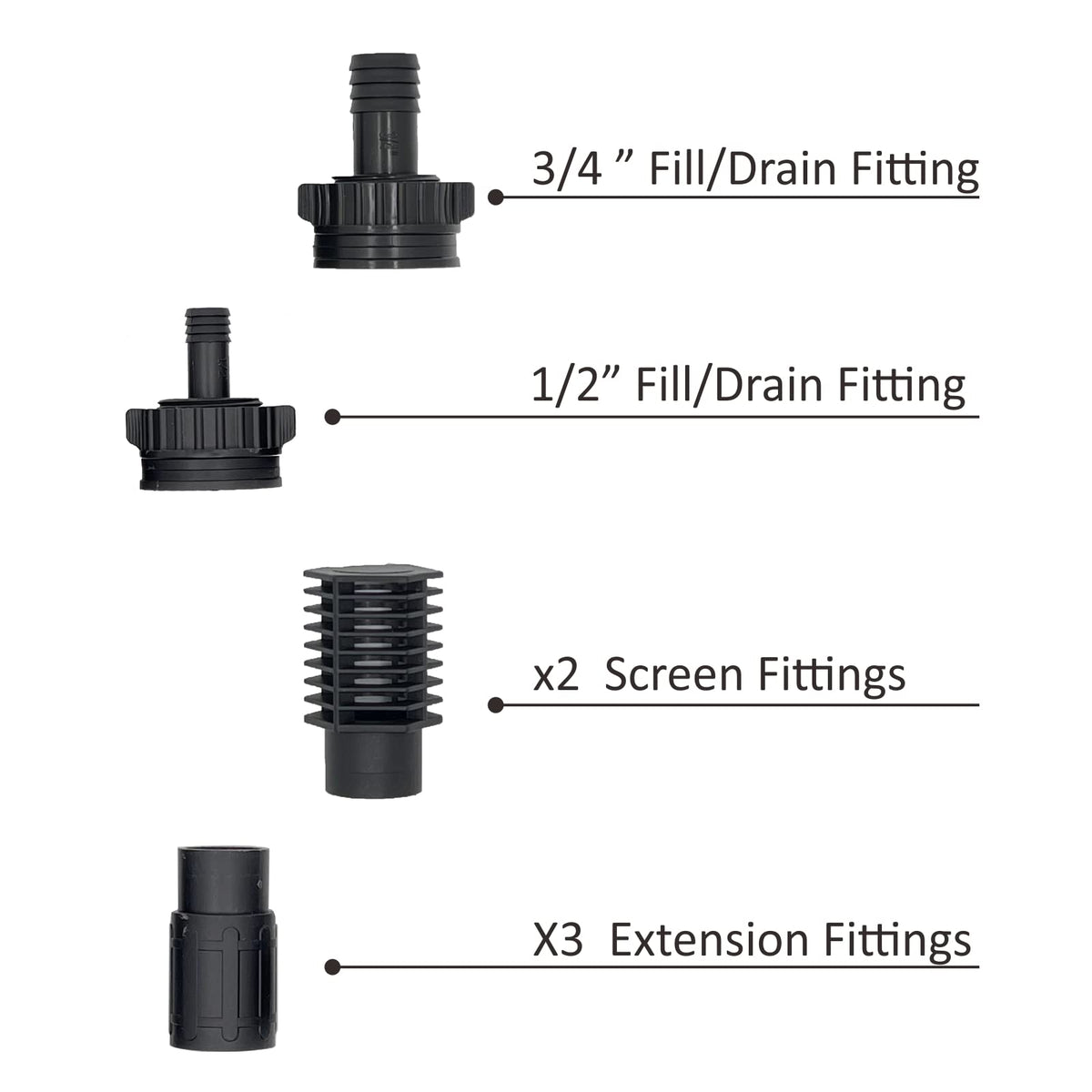 Product kit packag: 1 x 1/2'' Tub outlet fitting 1 x 3/4'' Tub outlet fitting 2 x Screen fitting 3 x Outlet extension fitting The kit is sealed in a transparent bag Each kit is made from 100% black virgin plastic and is BPA free Filling/draining kits made with the highest quality materials and craftsmanship, strict quality control to ensure tight fit Used in homemade tidal irrigation systems Can be used for hydroponics, Tidal irrigation, Aeroponic, aquaponics, flood and drain and drip irrigation systems