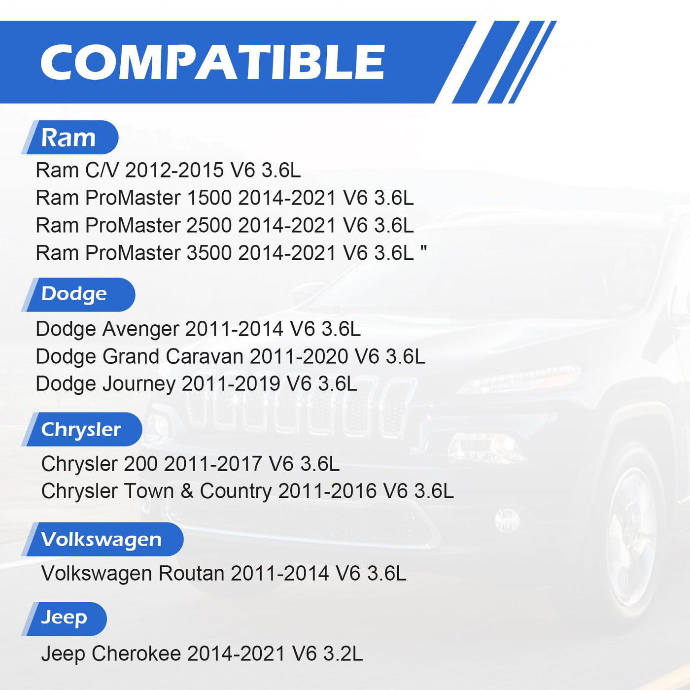 Note: Please ensure compatibility with your vehicle's specific year, make and model before purchasing.FITMENT:For Chrysler 200 2011-2017 V6 3.6LFor Chrysler Town & Country 2011-2016 V6 3.6LFor Volkswagen Routan 2011-2014 V6 3.6LFor Jeep Cherokee 2014-2021 V6 3.2LFor Ram ProMaster 1500 2014-2021 V6 3.6LFor Ram ProMaster 2500 2014-2021 V6 3.6LFor Ram ProMaster 3500 2014-2021 V6 3.6L