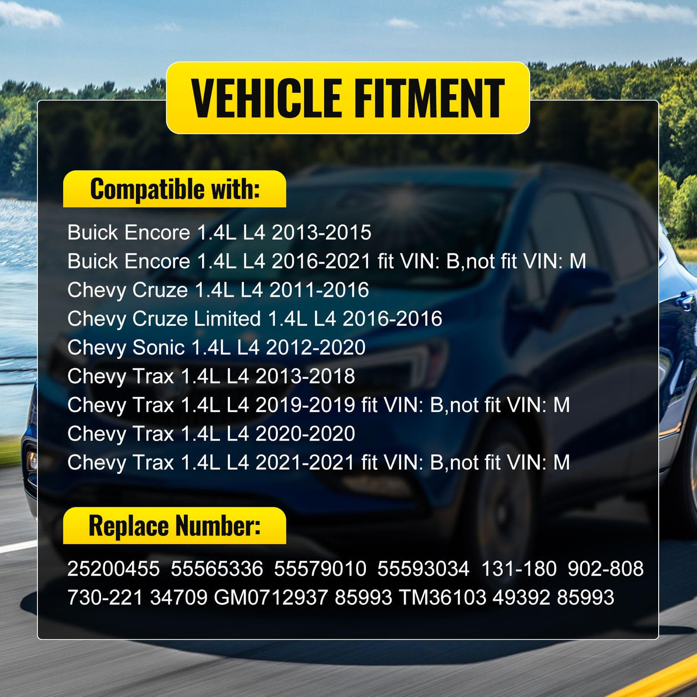 Note: Please ensure compatibility with your vehicle's specific year, make and model before purchasing.FITMENT::for Buick Encore 1.4L L4 2013-2015for Buick Encore 1.4L L4 2016-2021 fit VIN: B,not fit VIN: Mfor Chevy Cruze 1.4L L4 2011-2016for Chevy Cruze Limited 1.4L L4 2016-2016for Chevy Sonic 1.4L L4 2012-2020for Chevy Trax 1.4L L4 2013-2018for Chevy Trax 1.4L L4 2019-2019 fit VIN: B,not fit VIN: Mfor Chevy Trax 1.4L L4 2020-2020for Chevy Trax 1.4L L4 2021-2021 fit VIN: B,not fit VIN: M