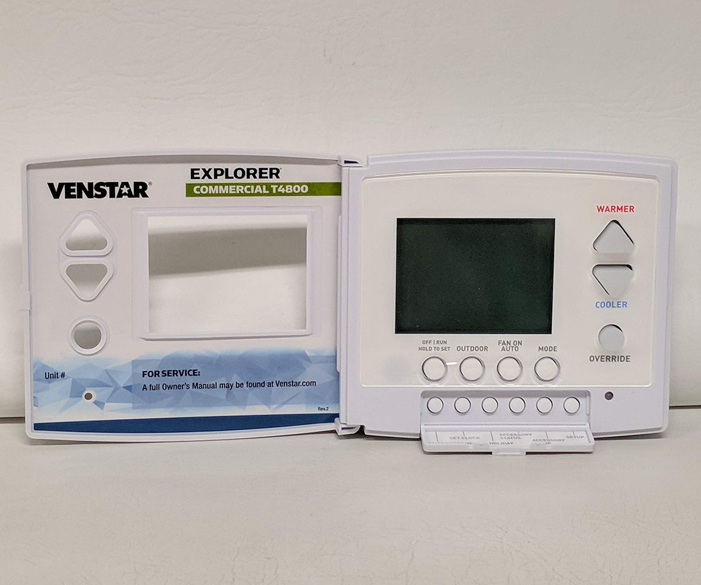 Venstar T4800 Voyager is a 4 heat/ 2 cool stages backlit programmable thermostat. It is compatible with a condensate overflow warning system-lockout compressor with message on display.