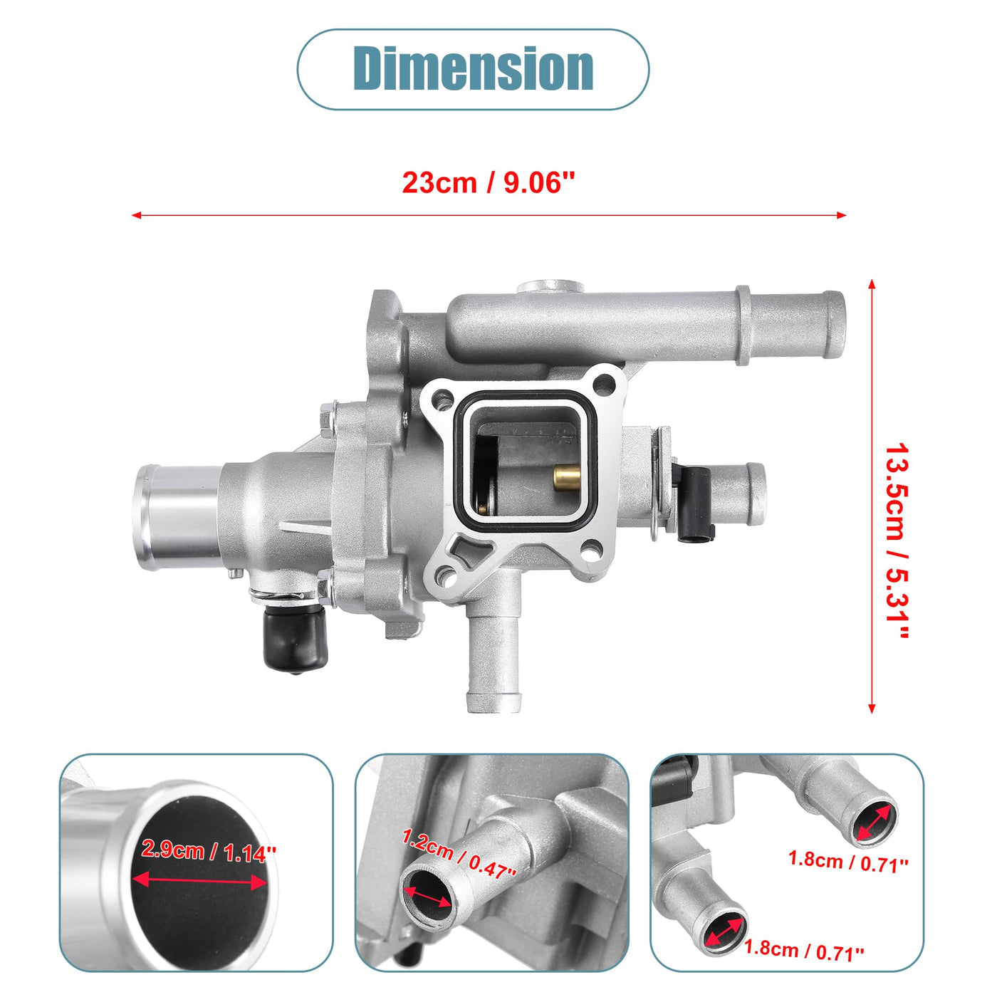 Feature:Upgraded material, the integrated coolant thermostat housing assembly is made of aluminum alloy to increase durability and long service lifeAutomatically adjust the water yield flowing into the radiator according to the temperature of the cooling water, so as to ensure that the engine works within the appropriate temperature range.The replacement coolant thermostat housing with sensorThis is a non-OEM product, accessory only!Symptoms of A Bad or Failing Thermostat:High-temperature ReadingLow-temperature ReadingEngine OverheatingUnstable Temperature ChangesCoolant leaks around the thermostat housing or under the vehicleReplaces Number:25199824, 25192228, 2519-2228, 55564890, 55577284, 15-81816, 902-033, 55579951, 96984103Fitment:for Chevrolet Cruze LS 1.8L L4 - Flex 2011-2012for Chevrolet Cruze LS 1.8L L4 - Flex, 1.8L L4 - Gas 2013-2015for Chevrolet Cruze Limited L, LS, LT 1.8L 2016for Chevrolet Sonic LS, LT, LTZ 1.8L L4 - Flex/Gas 2012-2014for Chevrolet Sonic LS, LT 1.8L L4 - Flex/Gas 2012-2014Specification:Housing Material: Aluminum AlloyGasket Material: RubberColor: Silver ToneNumber of Pins: 2Mount Hole Qty: 4Outlet Port Qty: 4Gasket or Seal Included: YesThermostat Included: YesTemperature Sensor Included: YesType: Outlet and Thermostat Housing KitInlet Diameter: 1.8cm / 0.71''Dimension: 23x13.5x7.7cm / 9.06''x5.31''x3.03''(L*W*H)Package Included:1 x Thermostat Housing Assembly with Sensor GasketPackage Contents: Thermostat, Thermostat Housing, Temperature Sensor, Gasket