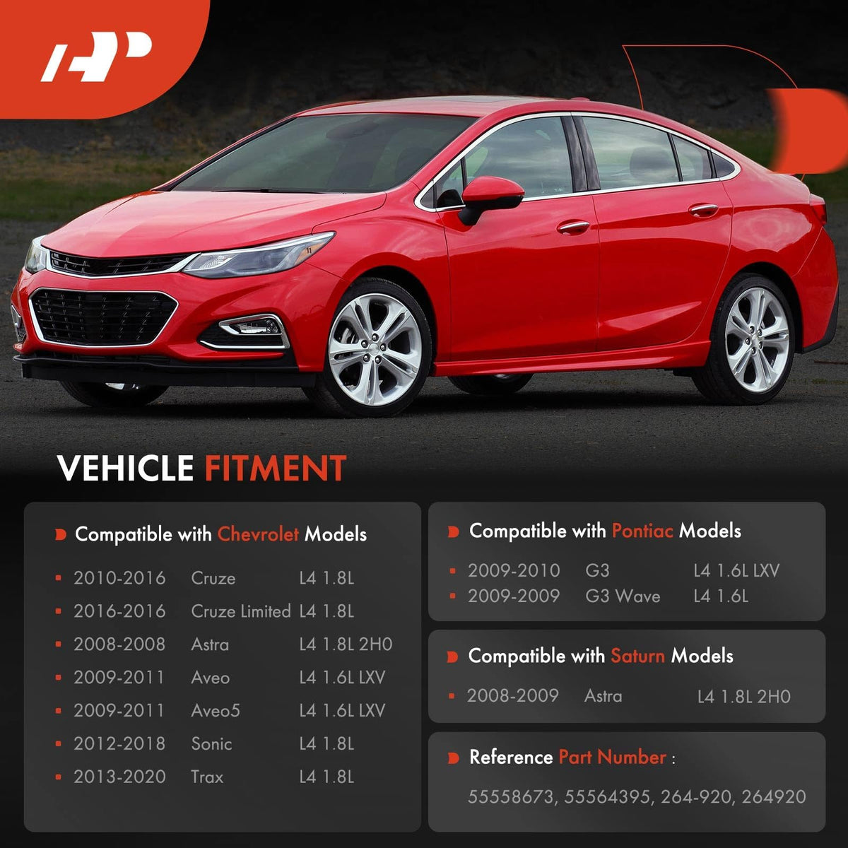 Compatible With Chevrolet Models: Aveo 2009-2011 L4 1.6L Petrol Engine Code Lxv Aveo5 2009-2011 L4 1.6L Petrol Cruze 2011-2015 L4 1.8L Flex Cruze 2011-2015 L4 1.8L Petrol Cruze Limited 2016 L4 1.8L Flex Cruze Limited 2016 L4 1.8L Petrol Sonic 2012-2018 L4 1.8L Flex Sonic 2013-2018 L4 1.8L Petrol Trax 2013-2017 L4 1.8L Petrol Compatible With Pontiac Models: G3 2009-2010 L4 1.6L Petrol Engine Code Lxv G3 Wave 2009 L4 1.6L Petrol Compatible With Saturn Models: Astra 2008-2009 L4 1.8L Petrol Engine Code 2H0