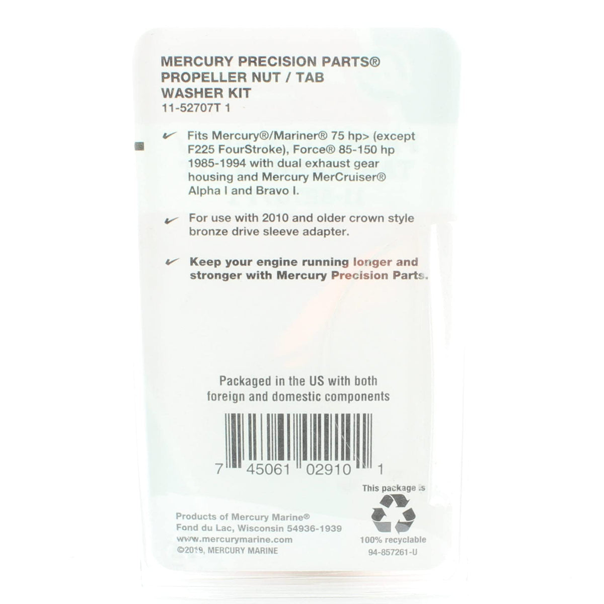 Part Number 11-52707T1.Mercury Propeller Nut / Tab Washer Kitfor Use On Marine Engines. Fits Mercury/Mariner 75 Hp ≫ (Except F225 Fourstroke), Force 85-150 Hp 1985-1994 With Dual Exhaust Gear Housing And Mercury Mercruiser Alpha I And Bravo I.New Oem Factory Part. Comes As Seen In Photo.Please Look Up Your Part Number Or Ask Us. You Are Responsible For Checking To See If This Fits Your Application. Cat-615