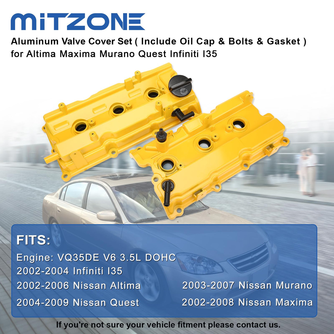 Mitzone Upgrade Aluminum Valve Covers (Yellow) Front& Rear Compatible With 2002-2009 Nissan Altima Maxima Murano Quest Infiniti