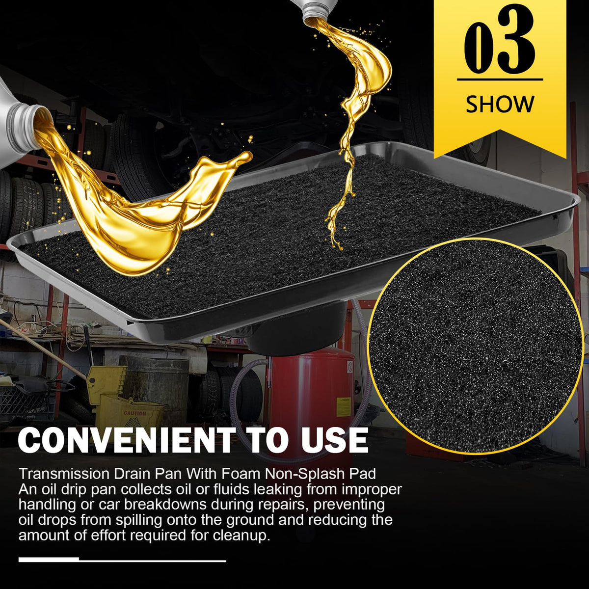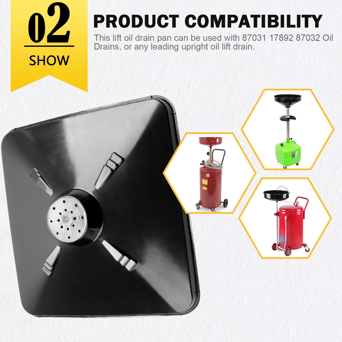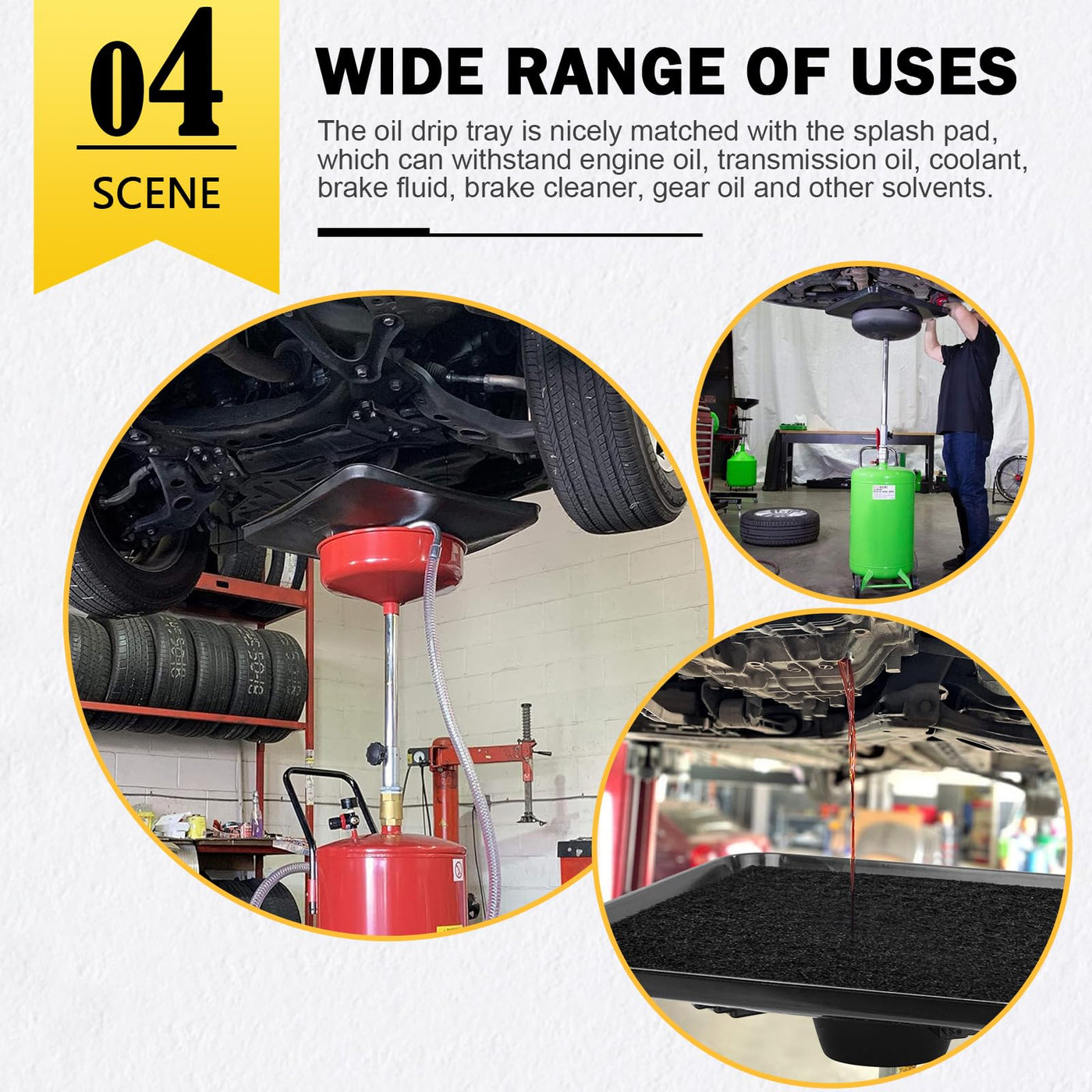 Compatibility with:This lift oil drain pan can be used with 87031 17892 87032 Oil Drains. Or any leading upright oil lift drain; Stackable design saves space in your shop,that prevents the drain lift pan from cracking if it is dropped or stepped on; Oil drain dolly pan easily pops back into place. Scope of Application The oil drip tray is nicely matched with the splash pad, which can withstand engine oil, transmission oil, coolant, brake fluid, brake cleaner, gear oil and other solvents, providing more convenience for you. Packing specification size 1 car oil drain pan,measuring about 23.42x22.63x5.5in 2 no splash oil drain pad measures about 22x22x0.8in
