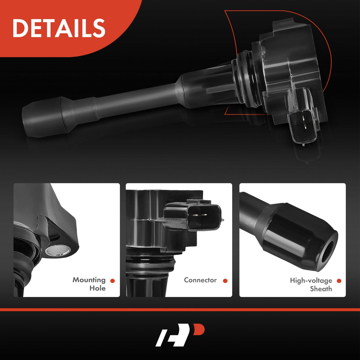 A-Premium ignition coils are a part of engine ignition system, inserting power into spark plugs and ensure fast starts, and an ideal choice to replace your broken coils. All ignition coils meet or exceed OEM specifications, which come with one year unlimited mileage quality guarantee. Application: Compatible with Infiniti FX50 2009-2013 V8 5.0L, Only for Cyl 1 to 6 Compatible with Infiniti M56 2011-2013 V8 5.6L Only for Cyl 1 to 6 Compatible with Nissan Altima 2007-2013 I4 2.5L Compatible with Nissan Cube 2009-2014 l4 1.8L Compatible with Nissan Rogue 2008-2012 I4 2.5L Compatible with Nissan Rogue Select 2015 I4 2.5L Compatible with Nissan Sentra 2009 I4 2.0L Compatible with Nissan Sentra 2007-2012 I4 2.5L Compatible with Nissan NV200 2013-2014 I4 2.0L Compatible with Nissan Tiida 2011 l4 1.6L Compatible with Nissan Versa 2007-2011 l4 1.6L Compatible with Nissan Versa 2007-2011 l4 1.8L Compatible with Nissan X-Trail 2011-2012 I4 2.5L Compatible with Nissan X-Trail 2008 I4 2.5L Reference Number: 22448ED000, 22448JA00A, 22448JA00C, UF-549 Compatible with Connector: 3 PinsQuantity Sold: Four Pieces
