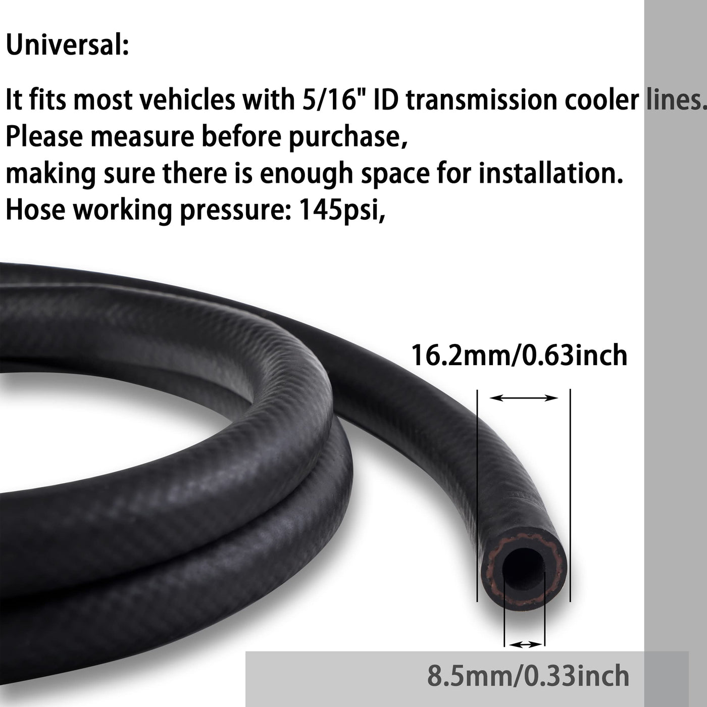 ?MATERIAL/SIZE? 15.66'' 7.5'' 0.75''inches Made with High Quality T-6061 Aluminum Hose working pressure: 145psi bursting pressure:900psi working temperature: -40? to 257? 100 percentage pressure tested?FUNCTION? Usable to cool down engine oil, transmission fluid Prenents heat related transmission failures Help to reduce transmission performance, extends life of transmission Save money Fits for most vehicles with 5/16''transmission cooler line, works great with older cars.?COMPATIBLE?Universal: It fits most vehicle with 5/16'' ID transmission cooler lines.Please measure before purchase,making sure there is enough space for installation.?INSTRUCTION?1.Identify the 4 Mounting Rods,4 Mounting Clips and 4X1 foam Pads.2.One bye one, Install the 4 Mounting Rods thru the Transmission Cooler3.Take rhe 1X1 Foam pads supplied, peel off the paper lining & side them onto the Mounting Rods,sticking them against rhe Transmission Cooler4.Take the cooler Assembly with attached looped hose and hold in the desired location5.Install the 4 Mounting Rods thru the Radiator/Condenser core.(Warning:Don't use excessive force when pushing the Mounting Rods through the Radiator/Condenser. Excessive force could cause damage to the find and possibly puncture a tube.)6.Take the Mounting Clips supplied, making sure they are in the correct direction(Deralr writing out) install onto the Mounting Rods and cinch them until the 1X1 foam Pads are slightly compressed.7.Cut off any excess Mounting Rods.?NOTICE? Professional installation is highly recommended It is strongly recommended to use an adjustable wrench Please read the detailed instructions below before buying! If you find that oil leakage occurs during use,you don't need to send back the product,Pleas