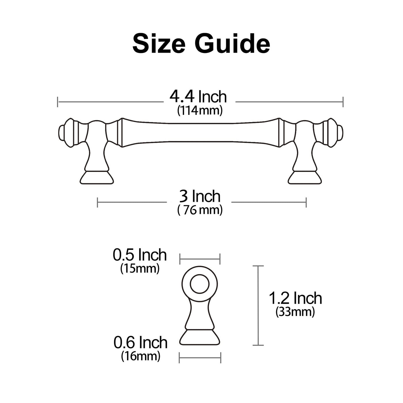 Q: What are the dimensions of the Alzassbg cabinet pulls?A: The Alzassbg cabinet pulls have an overall length of 4.4 inches (114mm) and a hole center measurement of 3 inches (76mm), with a projection of 1.2 inches (32mm).