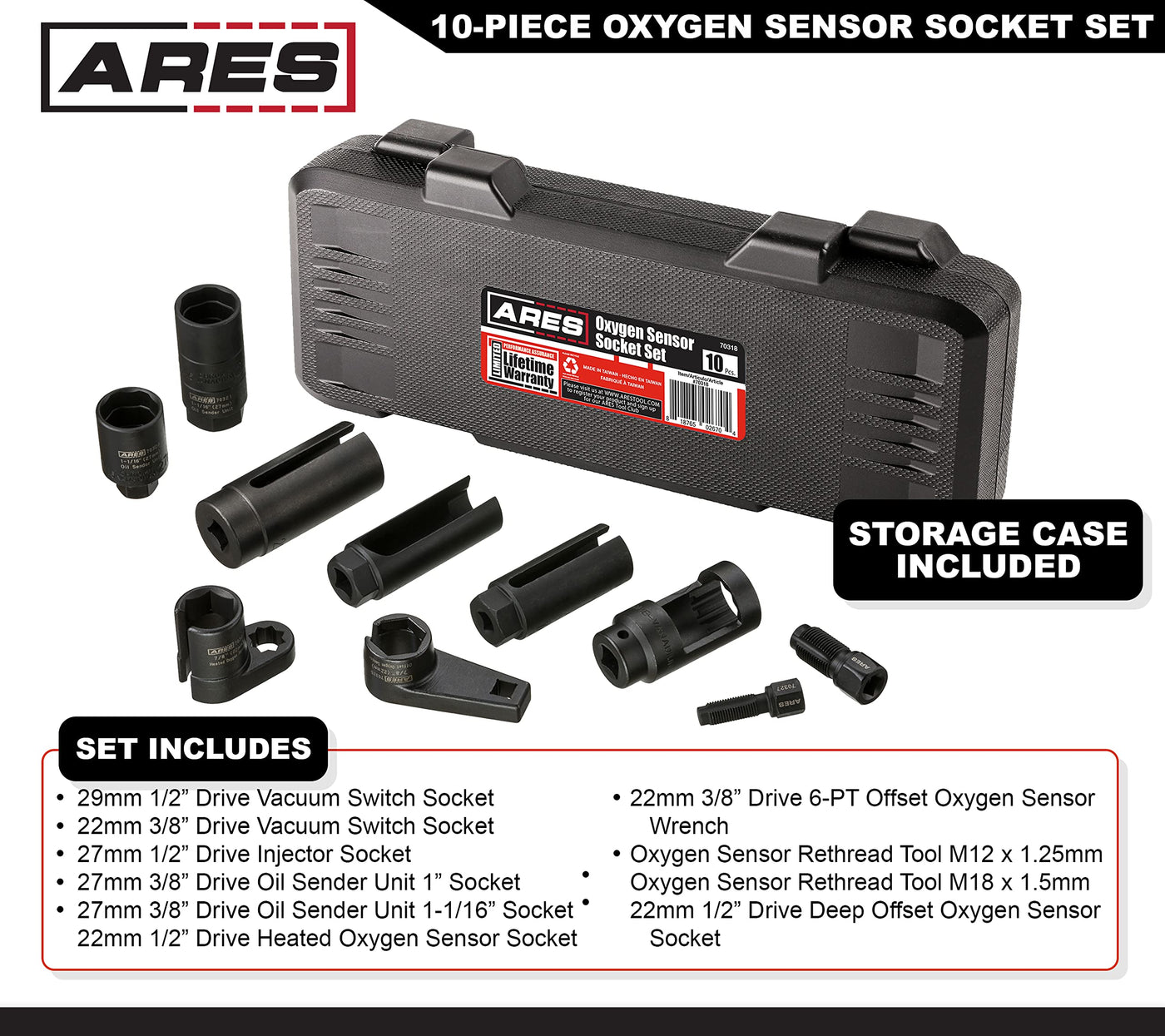 'A Complete Set For Oxygen SensorsThe ARES 10-Piece Oxygen Sensor Socket Set includes everything you need to make work on oxygen sensors easier. Every tool in this set is made from high strength Chrome Vanadium Steel with a Manganese Phosphate coating to resist corrosion, so these tools are built to last a long time. With the added bonus of a handy case, you'll never have to go hunting for the socket or rethread tool you need when you need it. Features: Includes: 2 pc. Oxygen Sensor Rethread Tools, 2 pc. Vacuum Switch Sockets, 2 pc. 3/8-inch drive 27mm Oil Sender Unit Sockets, 1 pc. Injector Socket, 1 pc. Heated Oxygen Sensor Socket, 1 pc. 6-Pt Offset Oxygen Sensor Wrench, 1 pc. Deep Offset Oxygen Sensor Socket, and 1 pc. storage caseRethread tool sizes: M12 x 1.25mm and M18 x 1.5mmVacuum switch socket sizes: 1/2-inch drive 29mm and 3/8-inch drive 22mmOil sender unit socket sizes: 1-inch and 1 1/16-inchInjector socket size: 1/2-inch drive 27mmHeated oxygen sensor socket size: 1/2-inch drive 22mmOffset oxygen sensor wrench size: 3/8-inch drive 22mmDeep offset oxygen sensor socket size: 1/2-inch drive 22mmMade of high strength Chrome Vanadium SteelManganese Phosphate coating resists corrosion