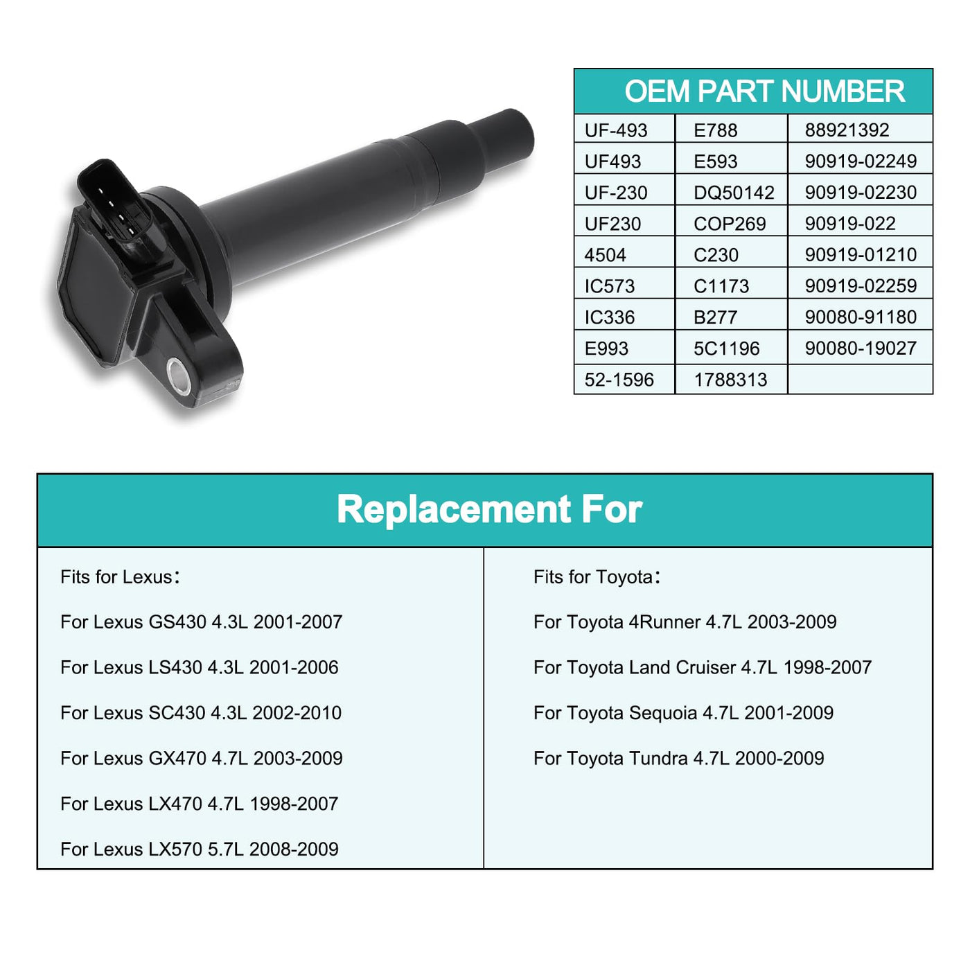 Q: What vehicles are compatible with the AULINK 8PCS UF493/UF230 Ignition Coil Pack?A: The AULINK Ignition Coil Pack is compatible with several Lexus models including GS430 (2001-2007), LS430 (2001-2006), SC430 (2002-2010), as well as Toyota models such as 4Runner (2003-2009), Land Cruiser (1998-2007), and Sequoia Tundra. It fits engines with 4.3L, 4.7L, and 5.7L.