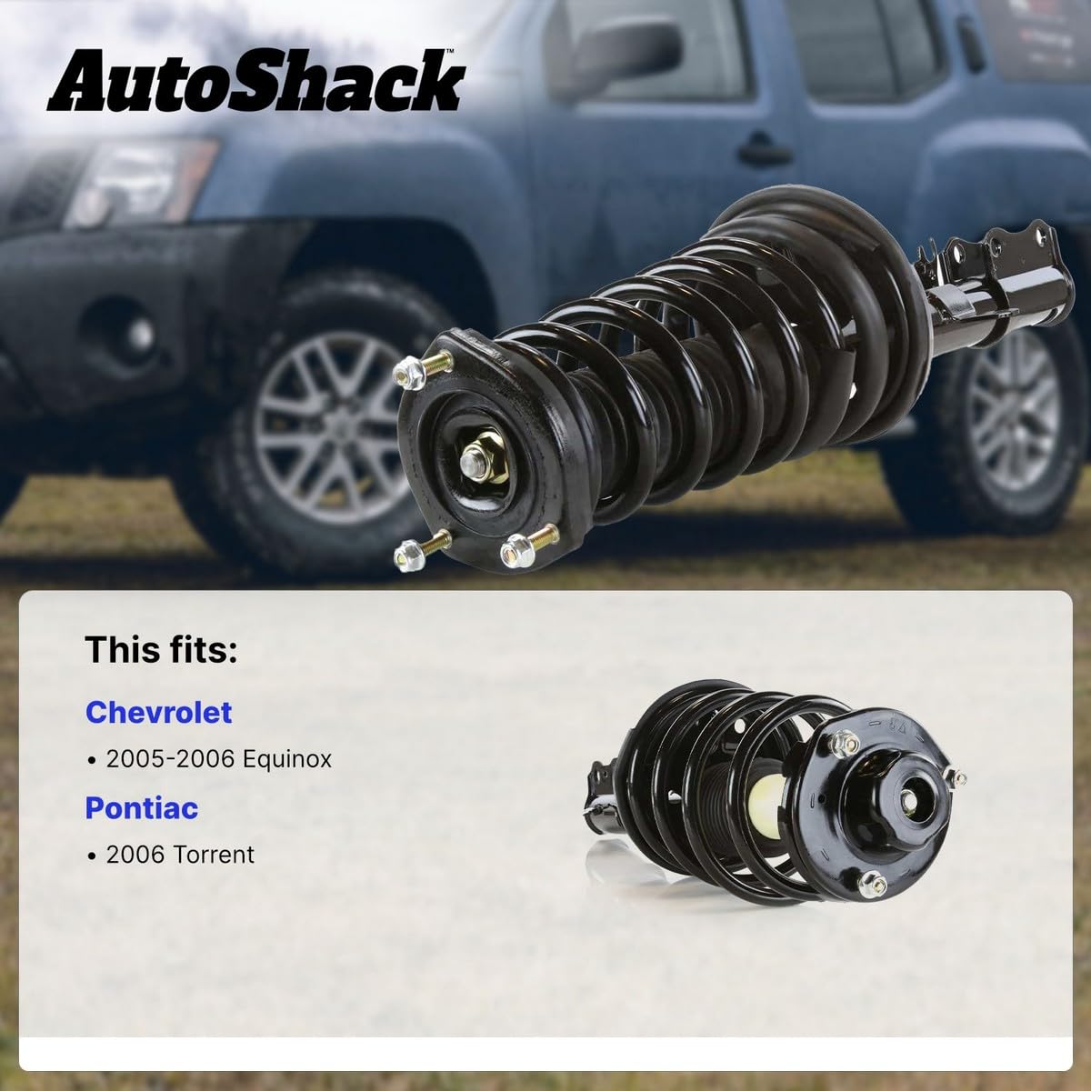 Q: What vehicles are compatible with the AutoShack Front Complete Struts Assembly?A: The AutoShack Front Complete Struts Assembly is designed as a replacement for the 2005-2006 Chevrolet Equinox and the 2006 Pontiac Torrent, specifically for models with a 3.4L V6 engine, both AWD and FWD configurations.