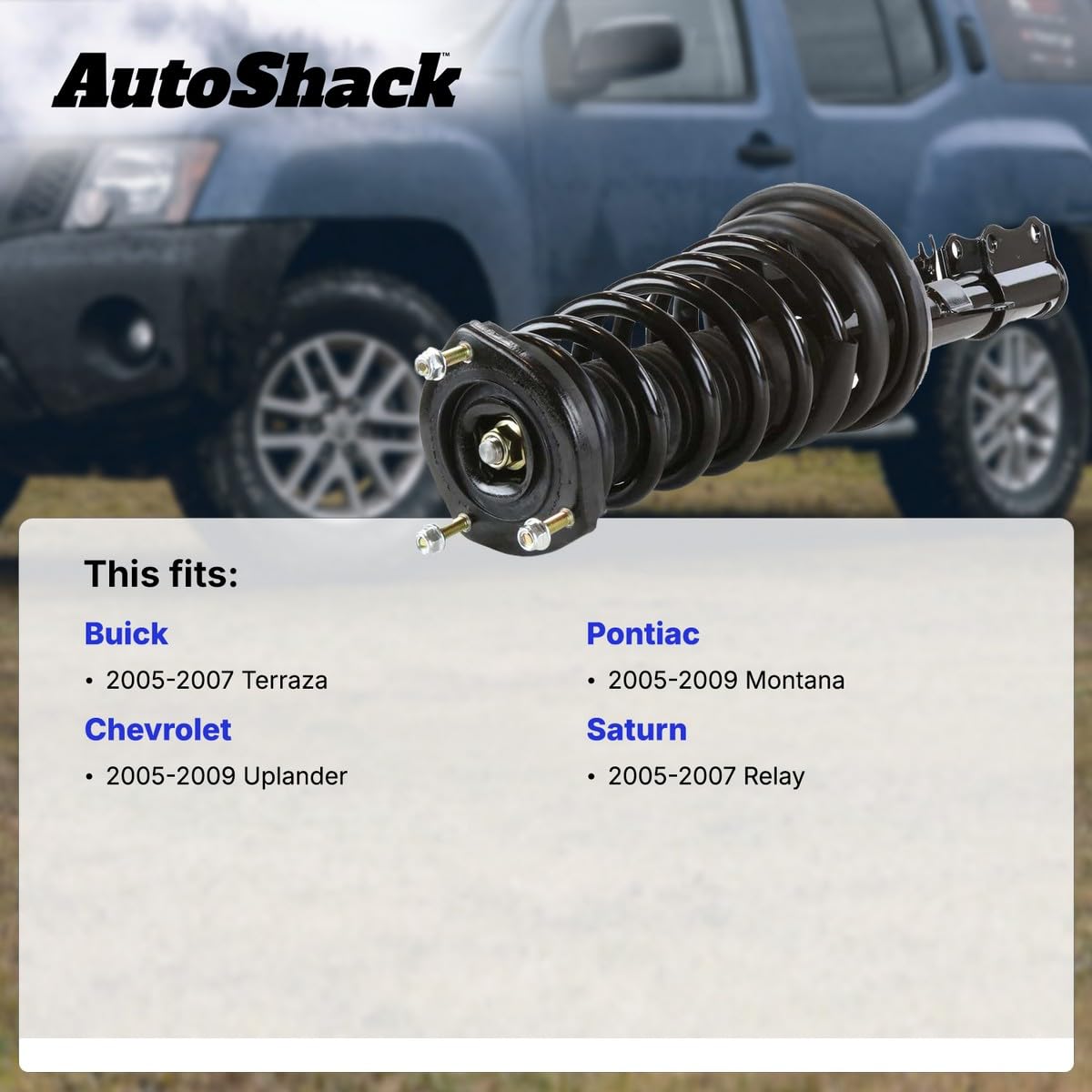 Q: What vehicles are compatible with the AutoShack Front Complete Struts Coil Springs Assembly?A: The AutoShack Front Complete Struts Coil Springs Assembly is designed for various models, including the 2005-2009 Saturn Relay, 2005-2007 Pontiac Montana, 2005-2007 Chevrolet Uplander, and 2005-2007 Buick Terraza. Always use Amazon's vehicle fitment tool to ensure compatibility with your specific vehicle.