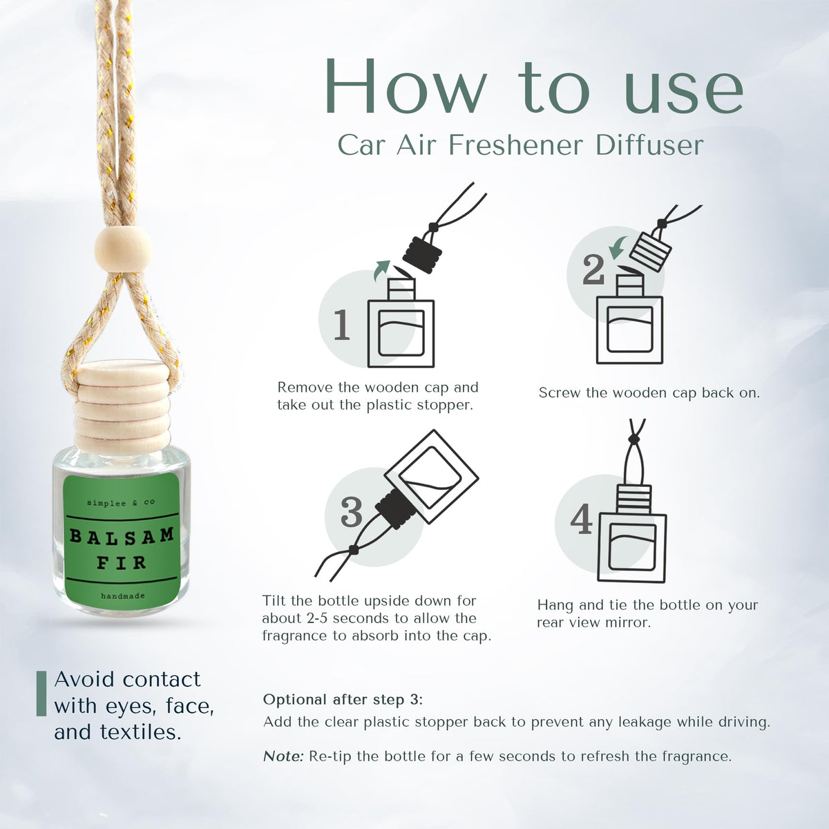 Elevate your driving experience with Simplee & co's elegant car hanging air oil diffusers. Explore our varied collection of fragrances to tailor the scent and ambiance of your vehicle to reflect your unique style. Crafted with high-quality USA Made Fragrance Oil, each diffuser delivers a superior and long-lasting scent. Simply tilt the diffuser towards the wooden cap to refresh the fragrance as needed. With proper care, enjoy up to 90 days of continuous, enchanting aroma, making every journey more enjoyable. Enhance your vehicle's atmosphere with a touch of sophisticated flair. Each order includes 2 oil diffusers. Balsam Fir Top: Green Middle: Pine Bottom: Wood, Musk Teakwood Mahogany Top Notes: Delicate teakwood Middle Notes: Warm mahogany Base Notes: Rich, woody undertones Midnight Black Ice (similar to Black Ice) Top Notes: Fresh bergamot Middle Notes: Wild lavender, understated florals Base Notes: Sandalwood, musk Fruity Rings (similar to Fruit Loops) Top Notes: Citrus zest, fruity sweetness Middle Notes: Cereal grain Base Notes: Vanilla, sugar Salted Caramel Top Notes: Coconut, caramelized sugar Middle Notes: Silky caramel vanilla Base Notes: Hint of salt Sandalwood Rose Top Notes: Delicate rose petals, fresh greenery Middle Notes: Rich earthy wood Base Notes: Soft musk Pink Sugar Top Notes: Sweet berries, fig leaves Middle Notes: Licorice, orange Base Notes: Cotton candy, caramel, powdery accents Baja Cactus Blossom Top Notes: Fresh florals, subtle coconut Middle Notes: Light floral blend Base Notes: Musk, sandalwood Apple Cinnamon Top: Green, Apple Middle:Peach, Cinnamon, Clove Bottom:Tonka Pumpkin Spice Latte Top: Butter Middle: Cinnamon, Clove Bottom: Coconut, Tonka, Black Coffee Eucalyptus & Spearmint Top: Mint Middle: Eucalyptus Bottom: Musk Eucalyptus Forest Top: Fresh Eucalyptus Middle: Peppermint Leaf Bottom: White Cedar Be Enchanted Top: Green Apple, Peach, Juicy Middle: Dew Rose, Water Lily Bottom: Cedar, Sandalwood, Vetiver, Musk Ocean Shore Linen Top: Fresh, Melon, Dewy Greens Middle: Fir Needles, Eucalyptus, Cyclamen, Aquatic Bottom: Sea Moss, Sandalwood, Cedarwood, Musk