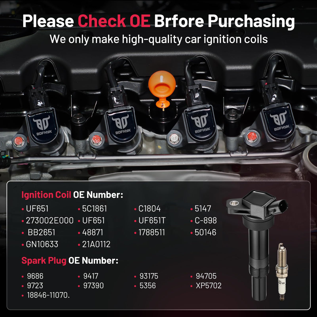 BDFHYK Ignition Coils UF651 and Iridium Spark Plug 9686 Compatible with Hyundai Elantra Coupe GT Tucson Kia Forte Soul l4 1.8L 2