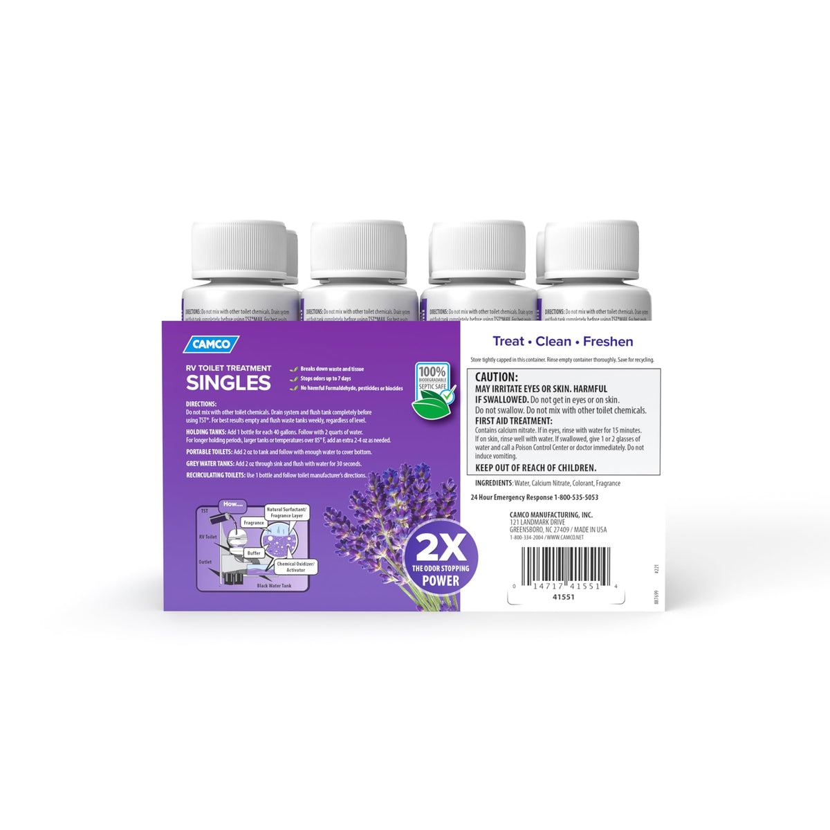 Camcos TST MAX Lavender RV Toilet Treatment Singles help control unwanted odors and break down waste and tissue in your RV or marine waste holding tank. Just (1) bottle treats up to a 40-gallon tank and stops odors for up to 7 days. This product is RV and marine approved and is completely biodegradable. It does not contain formaldehyde, pesticides or biocides and is safe for all septic tanks. Its even great for portable camping toilets! Includes (8) 4 oz. bottles with a fresh lavender scent. Made proudly in the USA. Camco makes quality products for RVing, boating, camping, towing, tailgating, and grilling that help you take your passion for the outdoors to the next level.