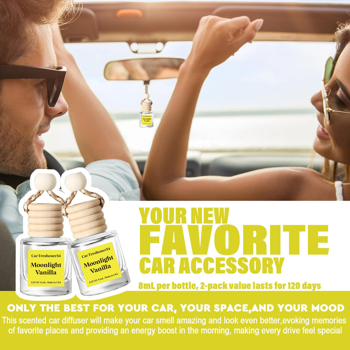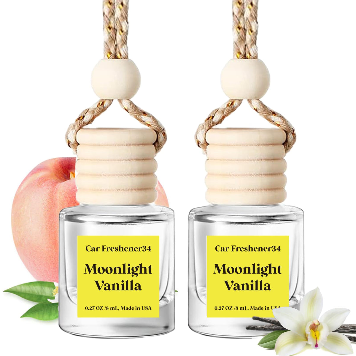 Two-pack car essential oil diffusers enhance your driving experience with delightful scents. Choose from over a dozen fragrances, ranging from subtle floral notes to rich woody aromas, ensuring there's a perfect match for your personality and mood. 2 pack car diffusers,16ml total (8ml each), Each bottle lasts for about 45 to 60 days, one hanging and one vent-mounted car air freshener, catering to various installation needs across different vehicle models.Many scents to choose from, launch a new scent every month.Below are the fragrance notes for our perfumes:Cherry Blossom:Top: creamy peach, orange blossom Middle: jasmine, clove, heliotropeBase: sugary vanilla, tonka bean, amber, woody, white muskMoonlight Vanilla:Top: anise, lemon, tarragonMiddle: floral (lily of the valley, heliotrope, geranium), cloveBase: musk, patchouli, tonka bean, cedarwoodPink Champagne:Top: citrus, apple, raspberryMiddle: rose, freesiaBase: woody, vanilla, amber, muskSea Salt & Freesia:Top: limey, cyclamen, magnolia, lily of the valleyMiddle: magnolia, lily of the valley, marine, lilyBase: muskBay Rum:Top: anise, lemon, tarragonMiddle: floral (lily of the valley, heliotrope, geranium), cloveBase: musk, patchouli, tonka bean, cedarwoodRose:Top: Fresh floralMiddle: RoseBase: Powder, vanillaHoney Bourbon:Top: alcohol accord, citrus (orange)Middle: herbal, floral (rose, heliotrope)Base: bourbon barrel accord, woody (patchouli), muskLondon Man:Top: marine, green (violet), citrus (bergamot, orange)Middle: herbal, floral (lily, freesia, jasmine)Base: woody (cedar, patchouli), amber, musk