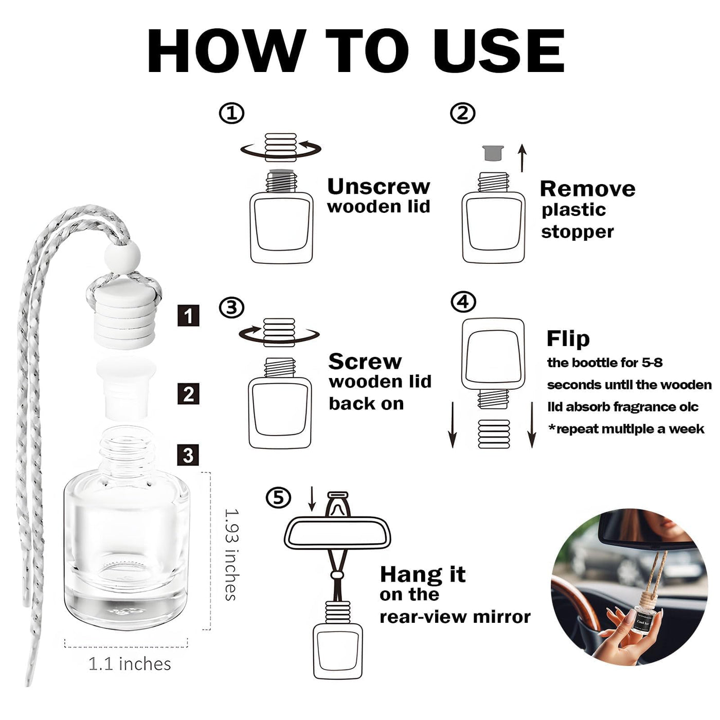 Two-pack car essential oil diffusers enhance your driving experience with delightful scents. Choose from over a dozen fragrances, ranging from subtle floral notes to rich woody aromas, ensuring there's a perfect match for your personality and mood. 2 pack car diffusers,16ml total (8ml each), Each bottle lasts for about 45 to 60 days, one hanging and one vent-mounted car air freshener, catering to various installation needs across different vehicle models.Many scents to choose from, launch a new scent every month.Below are the fragrance notes for our perfumes:Cherry Blossom:Top: creamy peach, orange blossom Middle: jasmine, clove, heliotropeBase: sugary vanilla, tonka bean, amber, woody, white muskMoonlight Vanilla:Top: anise, lemon, tarragonMiddle: floral (lily of the valley, heliotrope, geranium), cloveBase: musk, patchouli, tonka bean, cedarwoodPink Champagne:Top: citrus, apple, raspberryMiddle: rose, freesiaBase: woody, vanilla, amber, muskSea Salt & Freesia:Top: limey, cyclamen, magnolia, lily of the valleyMiddle: magnolia, lily of the valley, marine, lilyBase: muskBay Rum:Top: anise, lemon, tarragonMiddle: floral (lily of the valley, heliotrope, geranium), cloveBase: musk, patchouli, tonka bean, cedarwoodRose:Top: Fresh floralMiddle: RoseBase: Powder, vanillaHoney Bourbon:Top: alcohol accord, citrus (orange)Middle: herbal, floral (rose, heliotrope)Base: bourbon barrel accord, woody (patchouli), muskLondon Man:Top: marine, green (violet), citrus (bergamot, orange)Middle: herbal, floral (lily, freesia, jasmine)Base: woody (cedar, patchouli), amber, musk
